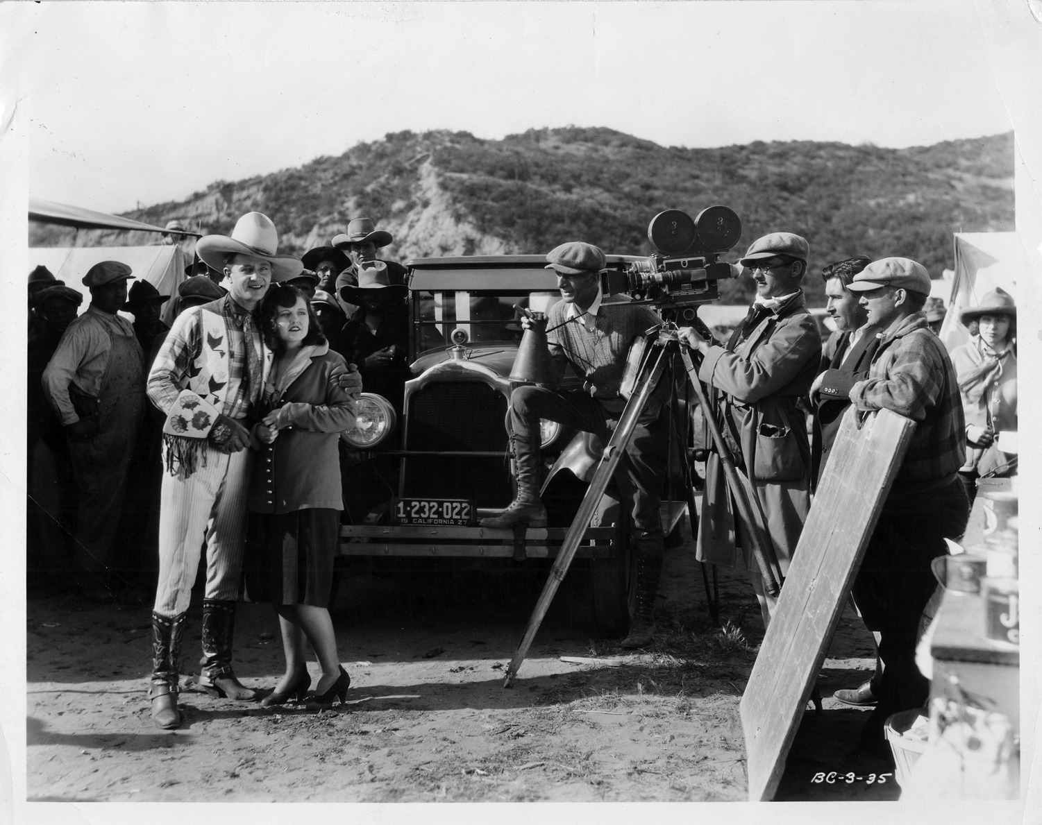 Packard Co. file photograph of a 1925-1926 Packard front view, on movie set, director Bill Bertram leaning on front bumper, actor Bill Cody posing with female. Inscribed on photo back: "Packard 333, third series six (produced 2/2/1925-8/1/1926), 6-cylinder, 60-horsepower, 133-inch wheelbase, 5-person club sedan (body type #265), early two-piece windshield, 1927 California license plate #1-232-022. Taken during gold rush scene on set of film "Gold From Weepah" starring Bill Cody, leading lady Doris Dawson, directed by Bill Bertram, also in cast David Dunbar and Fontaine LaRue, at Weepah, Nev."
