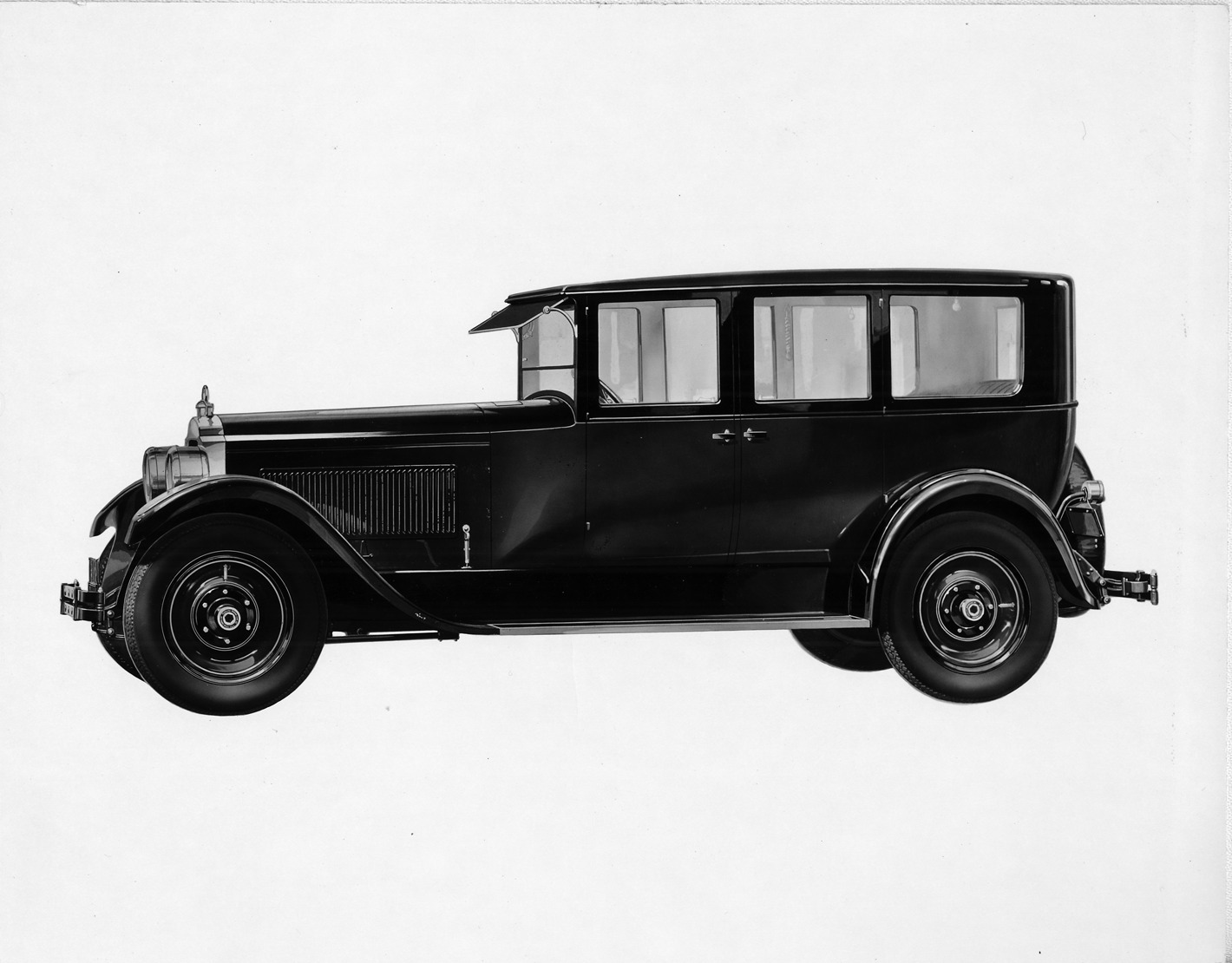 Packard Co. file photograph of a 1925-1926 Packard. Inscribed on photo back: "Packard 236, second series eight (produced 2/2/1925-8/1/1926), 8-cylinder, 85-horsepower, 136-inch wheelbase, 5-person sedan (body type #253), early type two-piece windshield, left seven-eights side, front."