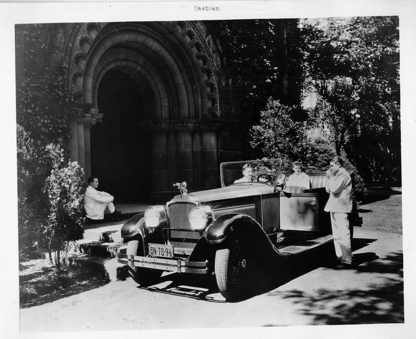 Packard Co. file photograph of a 1926 Packard three-quarter front view, top lowered, parked in front of large arched door way, male sitting on step, two male passengers, male standing at driver's door lighting cigarette. Inscribed on photo back: "Young Eastman and Princeton students, with eight phaeton, publicity."