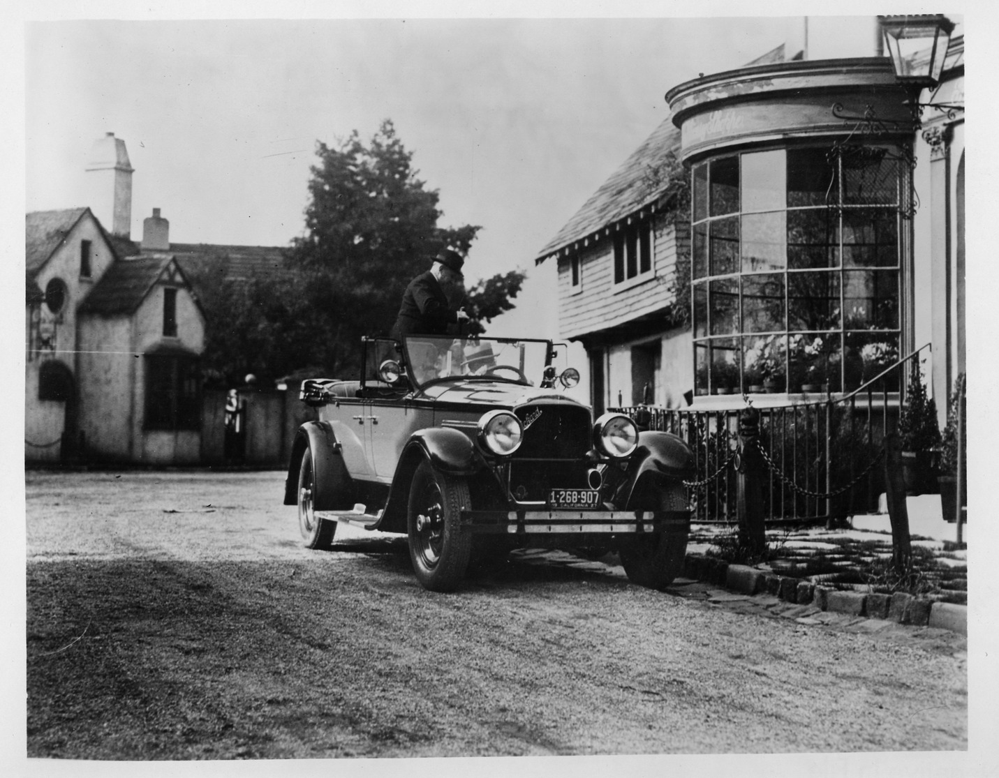 Packard Co. file photograph of a 1927 two-toned Packard three-quarter front view, top lowered, parked in front of store, male driver, owner Charles M. Schwab standing in back. Inscribed on photo back: "Packard 336, third series eight (produced 8/2/1926-7/1/1927), 8-cylinder, 106-horsepower, 136-inch wheelbase, 5-person phaeton (body type #291), special equipment: exterior horn mounted at front, dual spot lights mounted at either side of windshield, folding tonneau windshield, step plates mounted on running boards, fabric spare tire covers matching top, wind wings, 1927 California license plate #1-268-907, Charles M. Schwab, photographed outside The Whimsy Shoppe."
