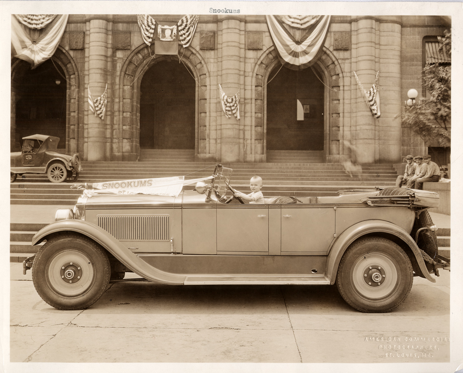 1927 Packard phaeton with Baby Snookums behind wheel in St. Louis, Missouri