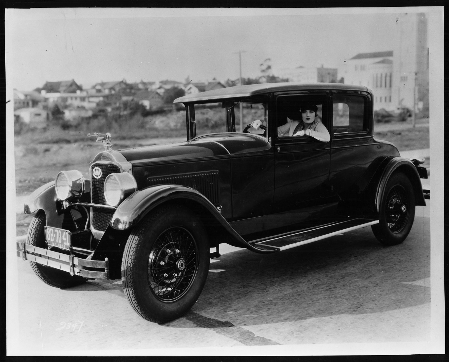 1927 Packard coupe, three-quarter left front view, actress Pauline Starke behind wheel