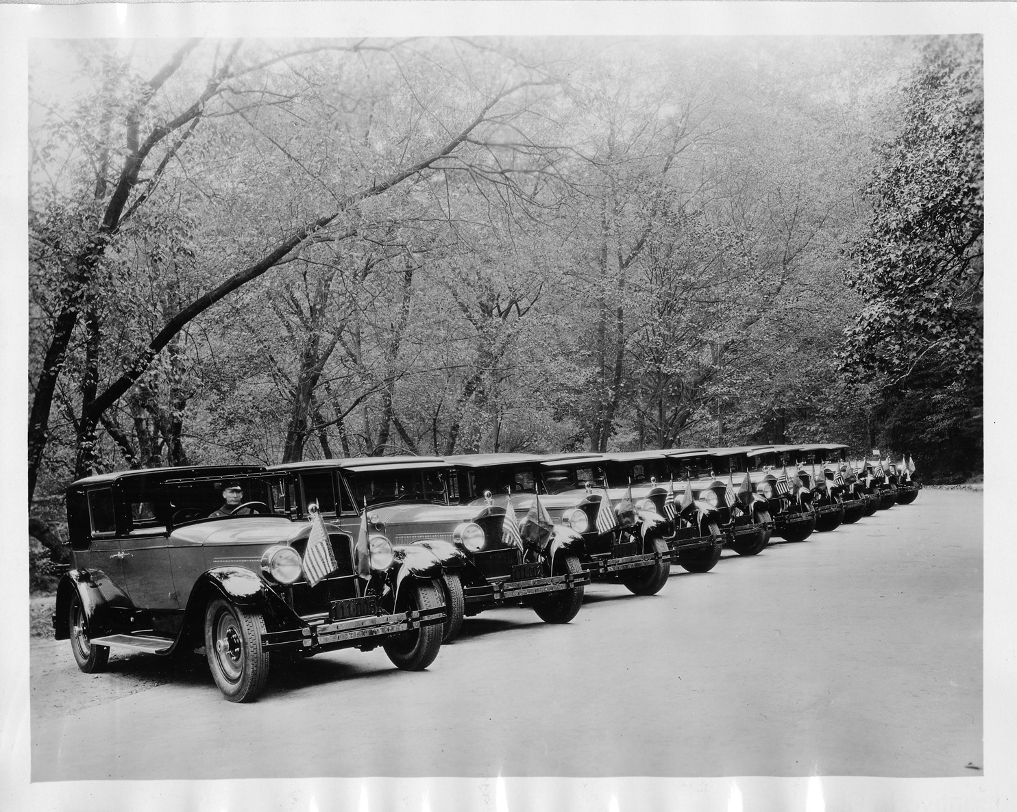 Packard Co. file photograph of several 1927 Packards lined up next to one another. Inscribed on photo back: "Packard 343, third series eight (produced 8/2/1926-7/1/1927), 8-cylinder, 106-horsepower, 143-inch wheelbase, left to right: Dietrich all weather stationary cabriolet, Holbrook inside drive limousine, standard sedan limousine 7-person (body type #295), two Holbrook inside drive limousines, standard sedan limousine 7-person (body type #295), Derham Prince-of-Wales type sedan, three standard sedan limousine 7-person (body type #295), forward car used for personal transportation of Queen Marie of Romania (other cars used by her entourage), during her visit to Washington, D.C. & Baltimore, Md."