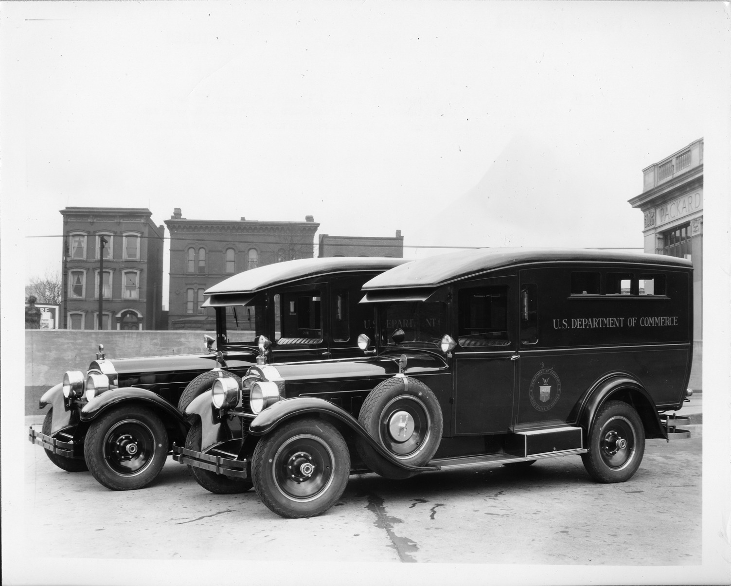 Packard Co. file photograph of two 1928 Packards three-quarter left front view, buildings in background. Inscribed on photo back: "Packard 443, standard eight (produced 7/1/1927-8/1/1928), fourth series eight, 8-cylinder, 106-horsepower, 143-inch wheel base, special radio van, built for U.S. Department of Commerce, photographed in front of Packard dealership."