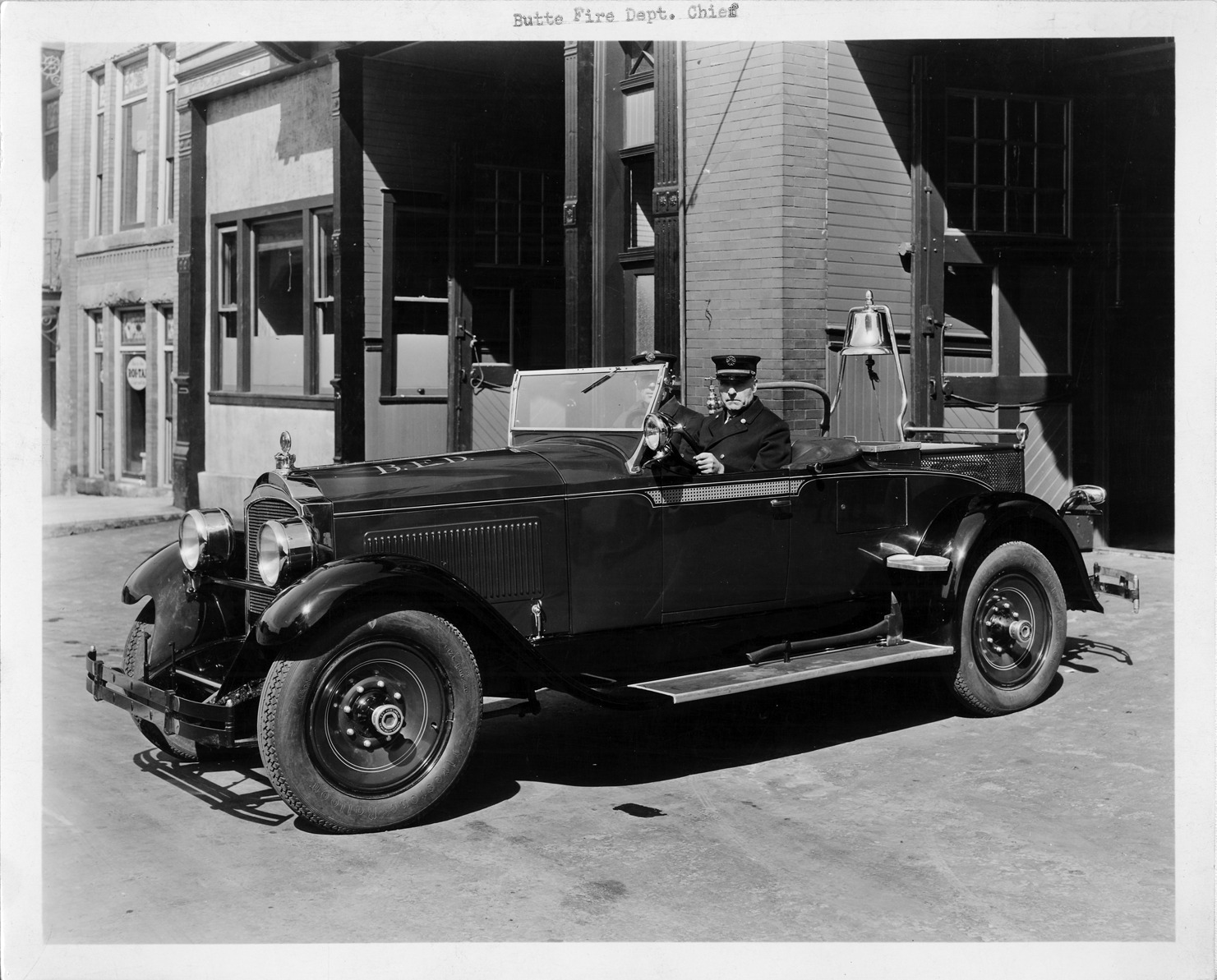 Packard Co. file photograph of a 1928 Packard three-quarter left front view, top lowered, man behind wheel, buildings in background. Inscribed on photo back: "Packard 526, fifth series six (produced 7/1/1927-8/1/1928), 6-cylinder, 81-horsepower, 126-inch wheelbase, 2/4-person based on a Model 526 runabout (body style #332), sold by Harry Bennett dealer, to Butte Fire Department, chief in car."