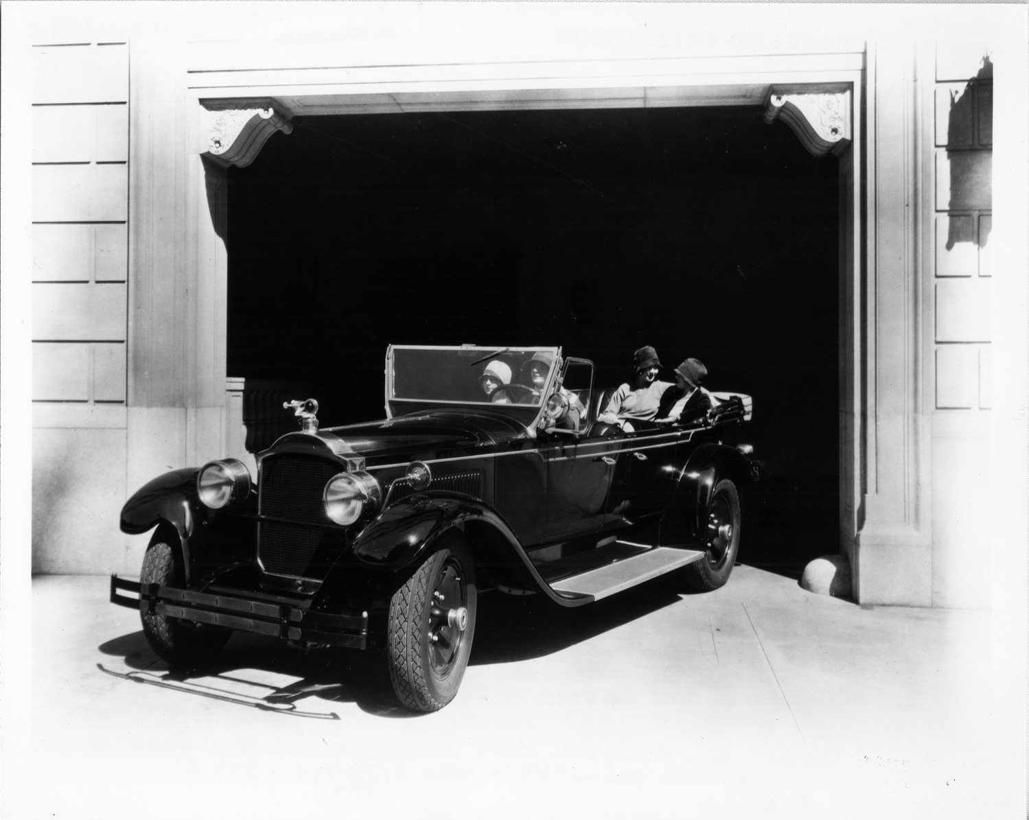 Packard Co. file photograph of a 1928 Packard pulling out of garage with female driver & three female passengers. Inscribed on photo back: "Packard 533, fifth series six (produced 7/1/1927-8/1/1928), 6-cylinder, 81-horsepower, 133-inch wheelbase, 7-person touring car (body style #320), one-half left side front view, top folded, fitted with Packard deluxe emblem, wind wings, rear-view mirror above left fender."