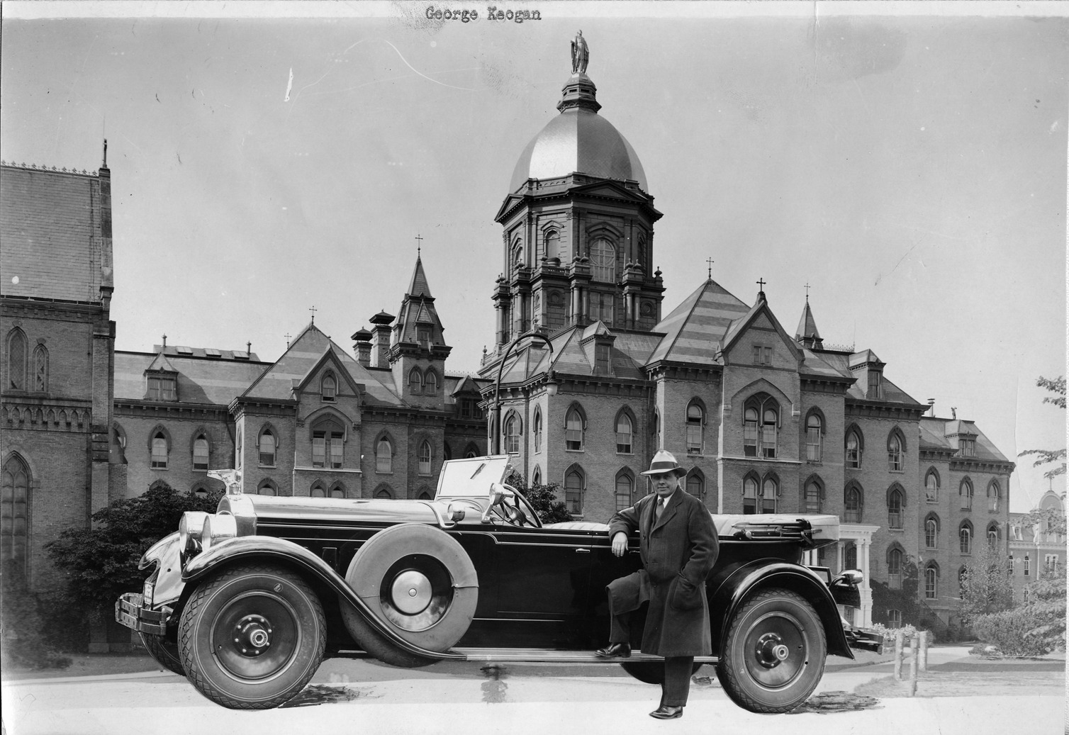 Packard Co. file photograph of a 1928 Packard left side view, top lowered, coach George Keogan at driver's door, photographed at the Main building on the campus of Notre Dame University. Inscribed on photo back: "Packard 443, custom eight (produced 7/1/1927-8/1/1928), fourth series eight, 8-cylinder, 106-horsepower, 143-inch wheelbase, 5-person phaeton (body type #311), George Keogan, coach of the famous Notre Dame basketball squad, ten time winner during his sixteen years of coaching, also asst. of Knute Rockne."