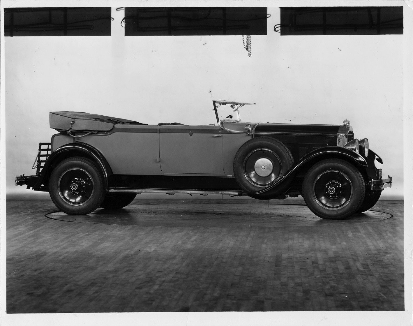Favorite this☆ 1929 Packard convertible victoria, nine-tenths right front view, top folded Description: Packard Co. file photograph of a 1929 Packard nine-tenths right front view, top folded. Inscribed on photo back: "Packard 645, deluxe individual custom eight, sixth series, 8-cylinder, 106-horsepower, 145.5-inch wheelbase, 4-person convertible victoria (body style #1601), body by Dietrich, prototype, monogram panel plate, 1928 Michigan license plate #20-124." Details Resource ID: EB01d428 Creator: Packard Motor Car Company Subject: Packard automobile Photographic prints Date Issued: 1929 Format: 1 photographic print ; 7.5 x 9.5 in. Member of: National Automotive History Collection Packard Collection Rights: Physical rights are retained by DPL. Copyright is retained in accordance with U.S. copyright laws.