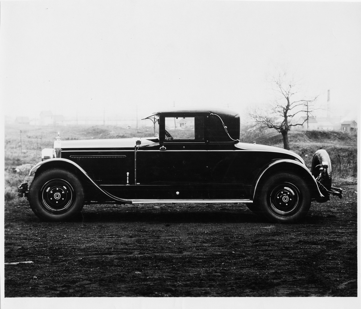 Packard Co. file photograph of a 1929 Packard left side view. Inscribed on photo back: "Packard 2-person coupe, 8-cylinder chassis, design like Rolls Royce coupe, with rumble seat, painting all black, ivory stripe & monogram, trimming wiese "snakeskin" cloth olive tan, built for Mr. Louis Hammer, New York City."