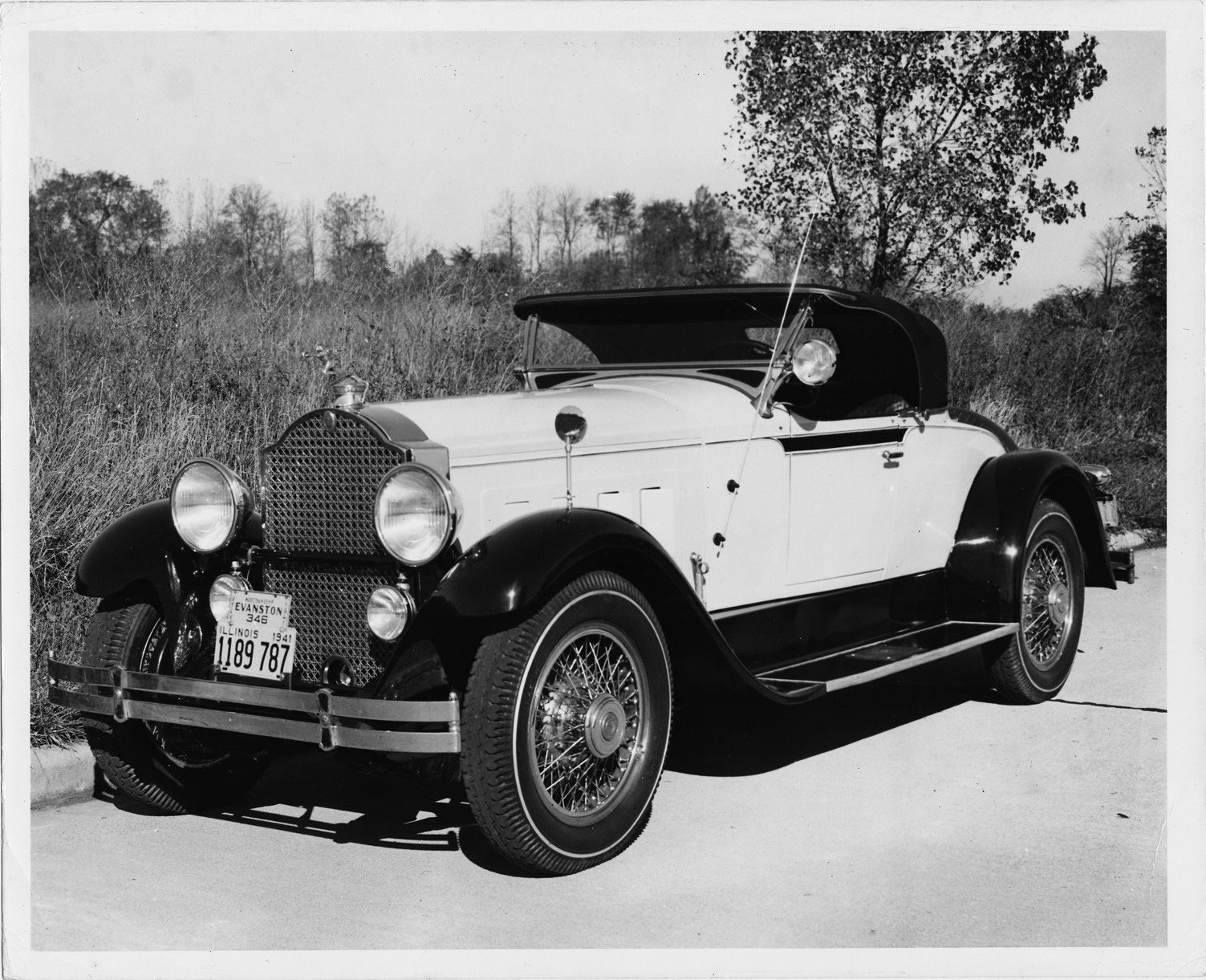 Packard Co. file photograph of a 1929 Packard three-quarter left front view, top raised, light in color. Inscribed on photo back: "Packard 626, speedster eight, sixth series, 8-cylinder, 130-horsepower, 126.5-inch wheelbase, 2/4-person runabout (body type #392), custom built by Packard in then new custom body department, 1941 Illinois license plate #1189-787, Evanston plate #346, note fog/driving lamps, fender mounted mirrors, radio antenna, non standard top, tires, Packard deluxe emblem, radiator grille."