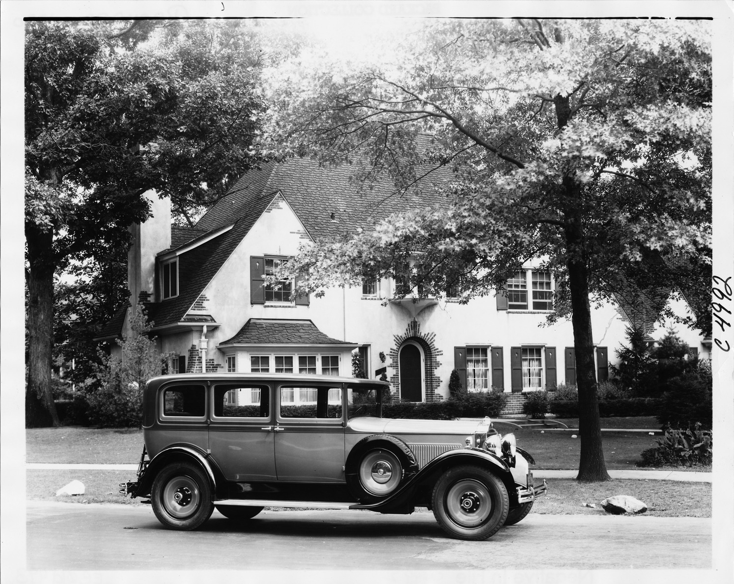 Packard Co. file photograph of a 1930 Packard right side view, parked on street, in front of house. Inscribed on photo back: "Packard 733, standard eight, seventh series, 8-cylinder, 90-horsepower, 134.5-inch wheelbase, 7-person sedan (body type #404), fitted with fender mounted side lights, 6-wheel equipment, folding trunk rack, 1929 Michigan license plate # M-62."