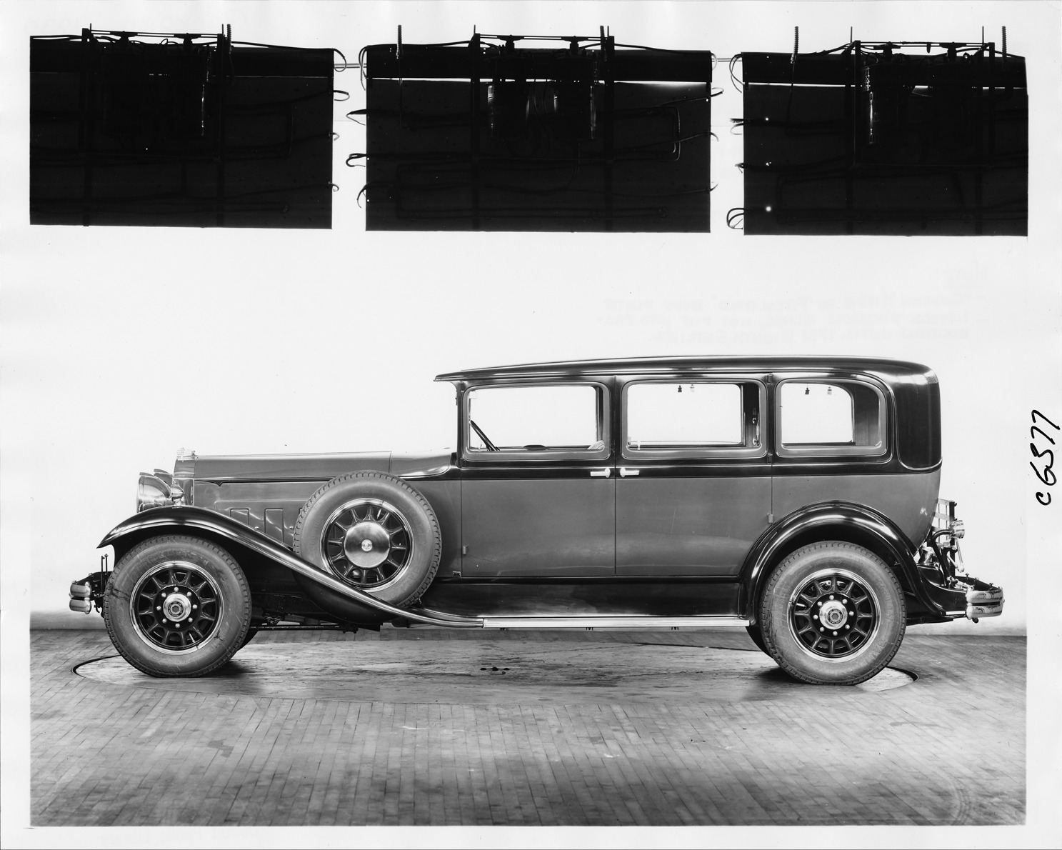 Packard Co. file photograph of a 1930 Packard left side view. Inscribed on photo back: "Packard 745, deluxe eight, seventh series, 8-cylinder, 106-horsepower, 145.5-inch wheelbase, 7-person sedan limousine (body type #425), prototype, note "custom made by Packard" body plate, 1-piece division glass, not put into production until 1931 eighth series."