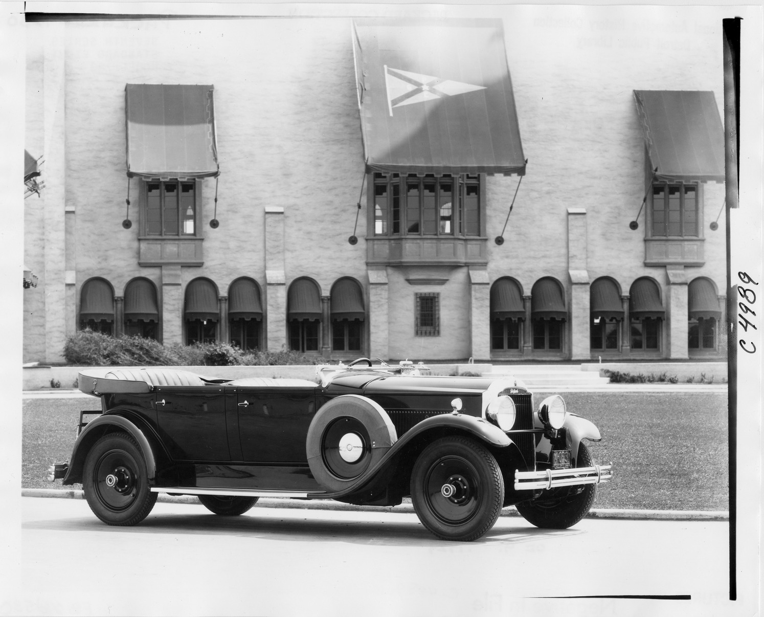 Packard Co. file photograph of a 1930 Packard three-quarter right front view, top folded, large building in background. Inscribed on photo back: "Packard 733, standard eight, seventh series, 8-cylinder, 90-horsepower, 134.5-inch wheelbase, 4-person phaeton (body type #401), note "Packard" script on radiator a la export models, 1929 Michigan license plate #4-093, setting Grosse Pointe Yacht Club, Mich."