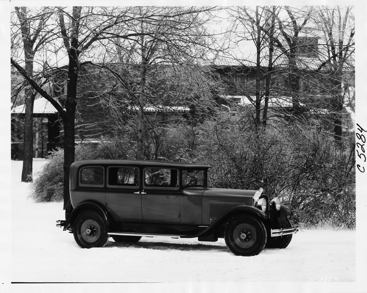1930 Packard sedan, nine-tenths right side view, parked in snow