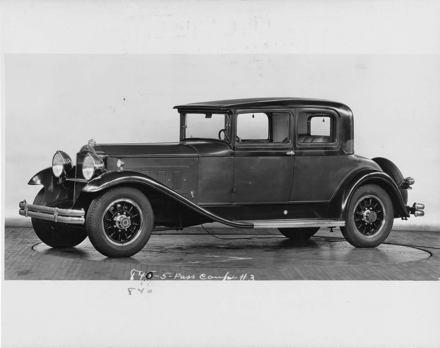 Packard Co. file photograph of a 1931 Packard three-quarter left side view, rear mounted spare tire. Inscribed on photo back: "Packard 840, deluxe eight, eighth series, 8-cylinder, 120-horsepower, 140.5-inch wheelbase, 5-person coupe (body type #477)."