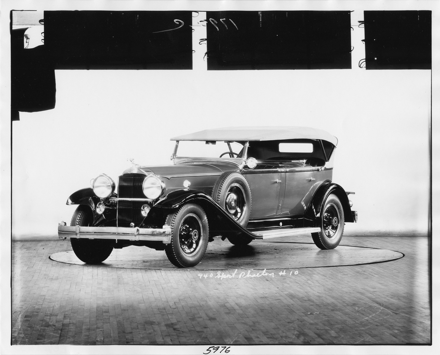Packard Co. file photograph of a 1932 Packard three-quarter front view, top raised, side mounted spare tire. Inscribed on photo back: "Packard deluxe eight, sport phaeton."