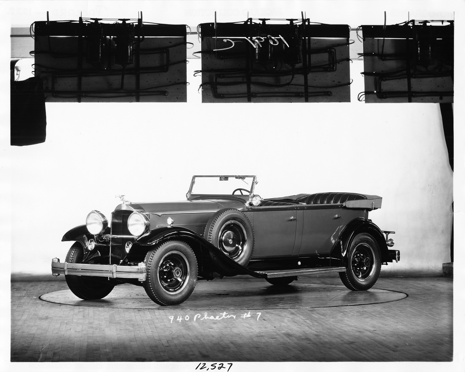 Packard Co. file photograph of a 1932 Packard three-quarter left side view, top folded. Inscribed on photo back: "Packard 903, deluxe eight, ninth series, 8-cylinder, 135-horsepower, 142.125-inch wheelbase, 4-person phaeton (body type #511), deluxe equipment, prototype, labeled model 940."