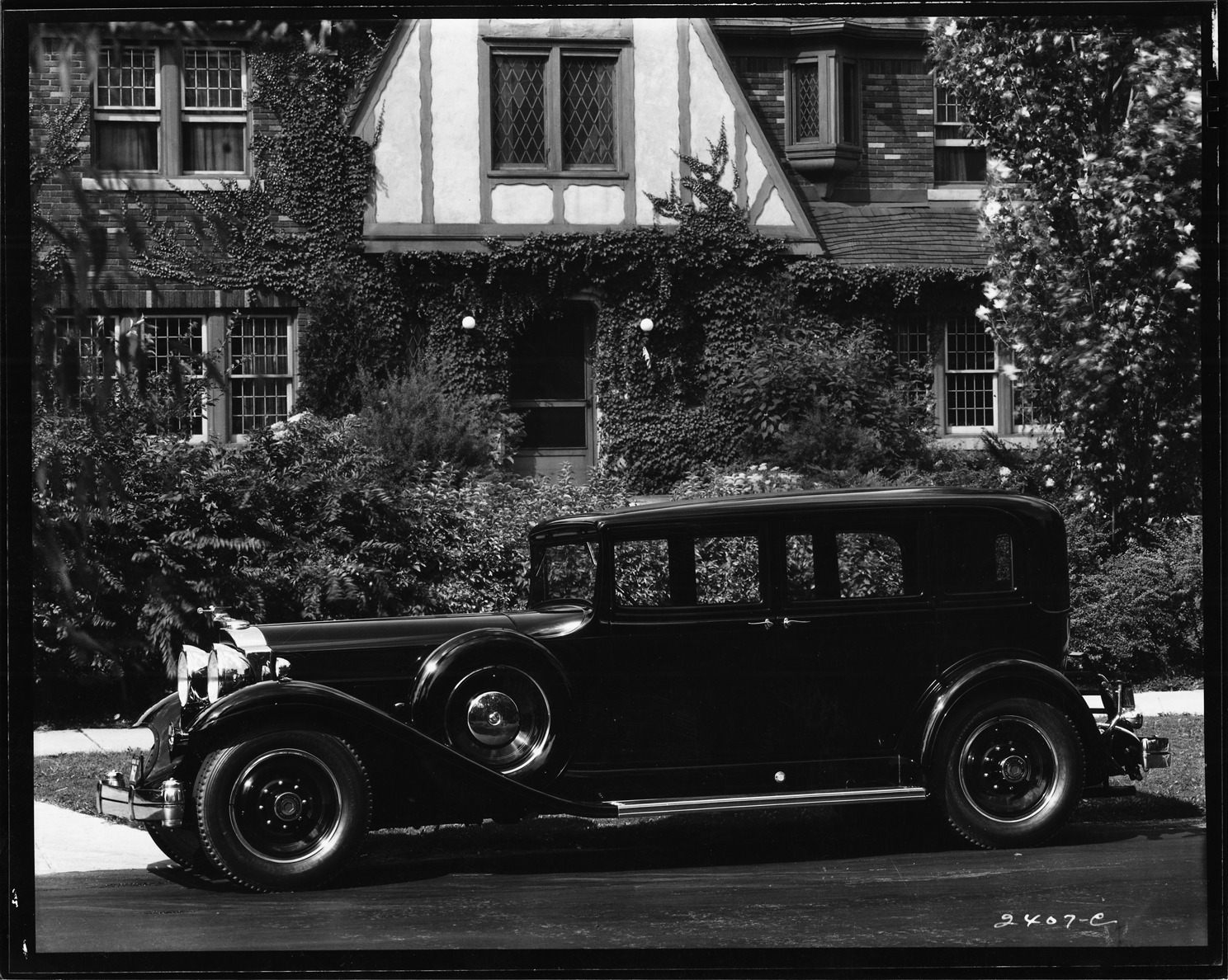 1932 Packard sedan, left side view, parked on street in front of house
