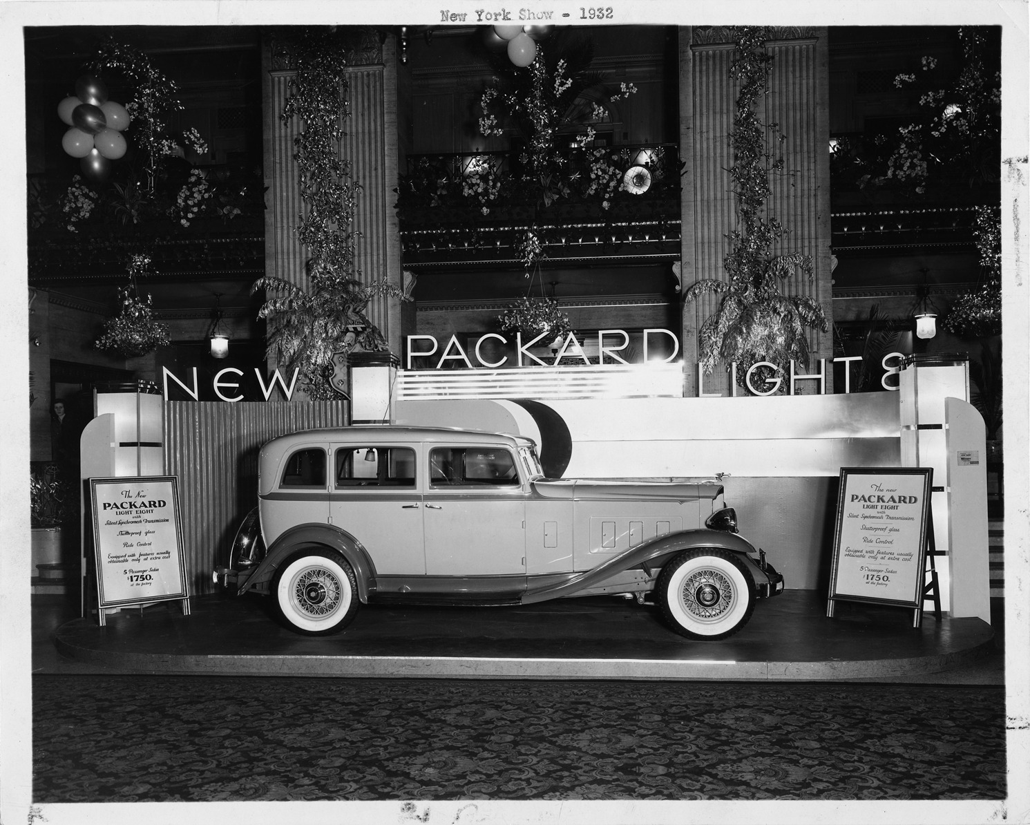 Packard Co. file photograph of a 1932 Packard left side view, sign reads "New Packard Light 8," smaller signs on either end of car. Inscribed on photo back: "Packard 900, light eight, ninth series, 8-cylinder, 110-horsepower, 127.75-inch wheelbase, 5-person sedan (body type #553), Packard Motorcar Co. display at Hotel Roosevelt, New York City, during the 32nd Annual National Automobile Show."