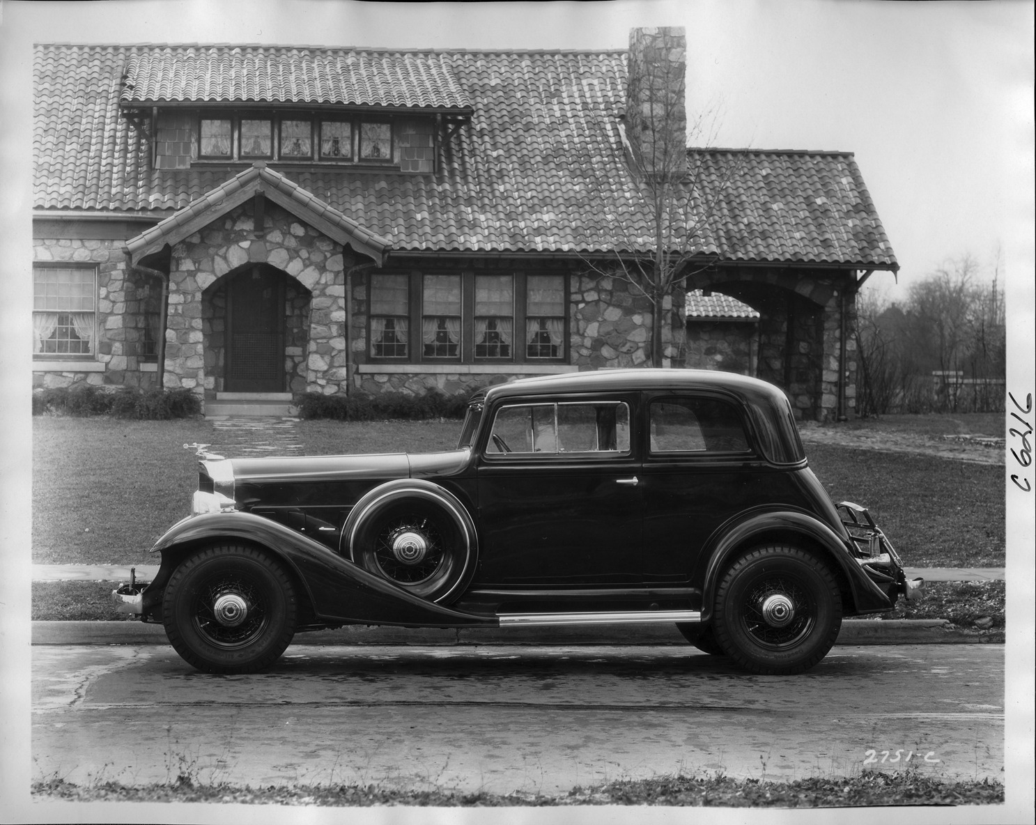 1933 Packard coupe sedan, left side view, parked on street in front of house