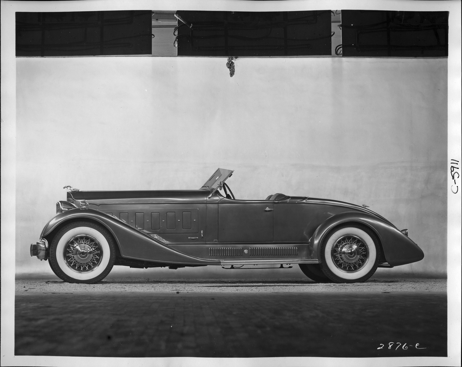 Packard Co. file photograph of the 1933 version of the "Brown Bomber," left side view, top folded. Inscribed on photo back: "Packard Macauley speedster, note alterations on 1933 version: full front fenders; high peaked crowns, full deading, skirts, pontoon rear fenders; high peaked crowns, beading around wheel openings, "Packard Twelve" hub caps, twin tail lights with vee lenses; tops of rims repeat, Packard radiator shape theme, radio antenna beneath running board."