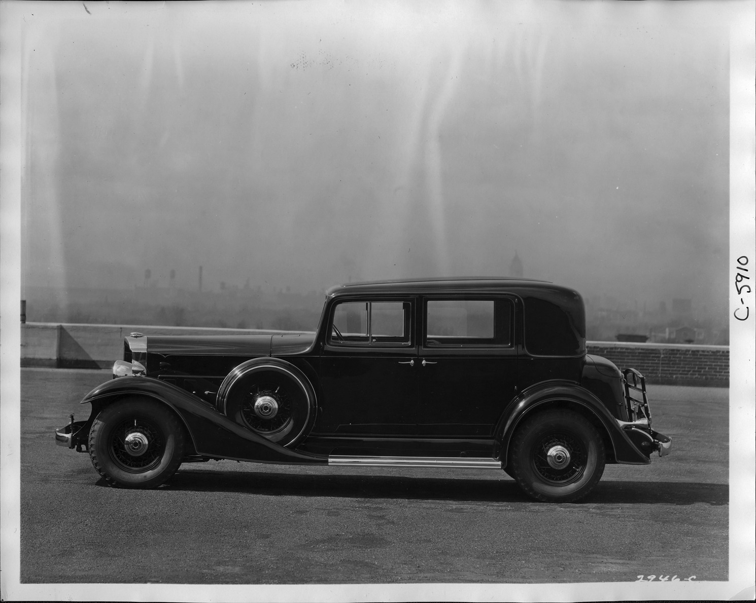 Packard Co. file photograph of a 1933 Packard left side view. Inscribed on photo back: "Packard 1002 eight, tenth series, 8-cylinder, 120-horsepower, 136-inch wheelbase, 5-person club sedan (body type #616), fitted with new integral trunk, side carrier with metal wheel covers, on April 3rd 1933 club sedan (#616) prices were raised to $2470, covering a new standard equipment metal trunk contoured to the rear body shape, though removable with suitcases & hat box to fit, available as accessories."
