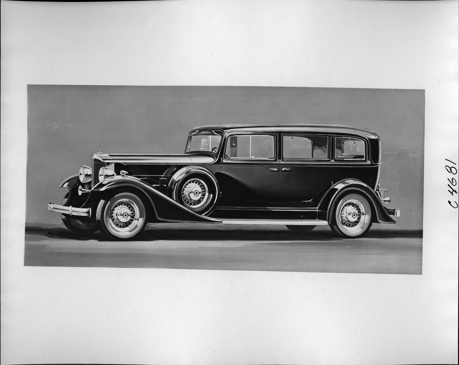Packard Co. file photograph of a 1933 Packard nine-tenths left side view. Inscribed on photo back: "Packard 1002 eight, tenth series, 8-cylinder, 120-horsepower, 136-inch wheelbase, 7-person sedan limousine (body type #615)."