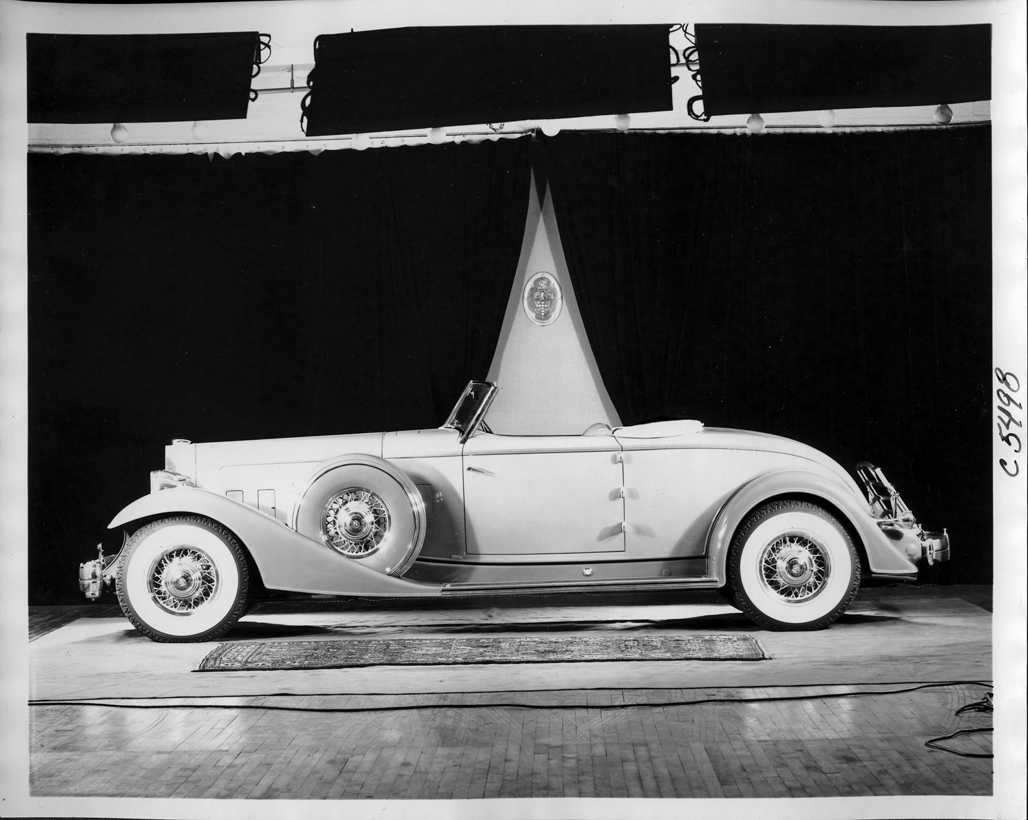 Packard Co. file photograph of a 1933 Packard left side view. Inscribed on photo back: "Packard 1006 twelve, tenth series, 12-cylinder, 160-horsepower, 147-inch wheelbase, 2/4-person convertible runabout (body type #3071), by Dietrich, Inc., note convertible top in down position, side wheel carrier with metal covers, chromium plated wheels."