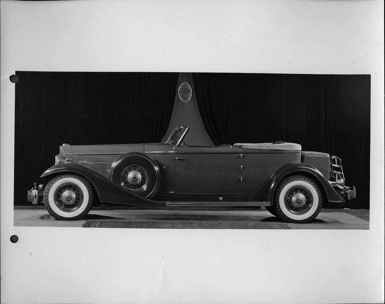 Packard Co. file photograph of a 1933 Packard left side view. Inscribed on photo back: "Packard 1006 twelve, tenth series, 12-cylinder, 160-horsepower, 147-inch wheelbase, 5-person convertible victoria (body style #3072), by Dietrich Inc., note convertible top in down position, side wheel carrier with metal covers."
