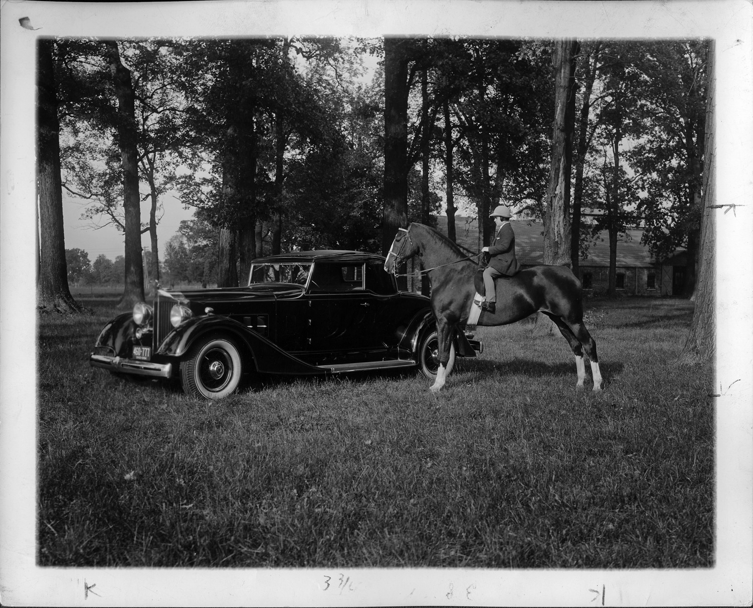 Packard Co. file photograph of a 1934 Packard seven-eights left side view, rider mounted on horse standing near rear driver side. Inscribed on photo back: "Packard 1101 eight, eleventh series, 8-cylinder, 120-horsepower, 136-inch wheelbase, 2/4-person coupe (body type #718), Miss Roseanne Leckie and Virginny Ler (Bay mare), at Columbus Riding Club, Columbus, Ohio."