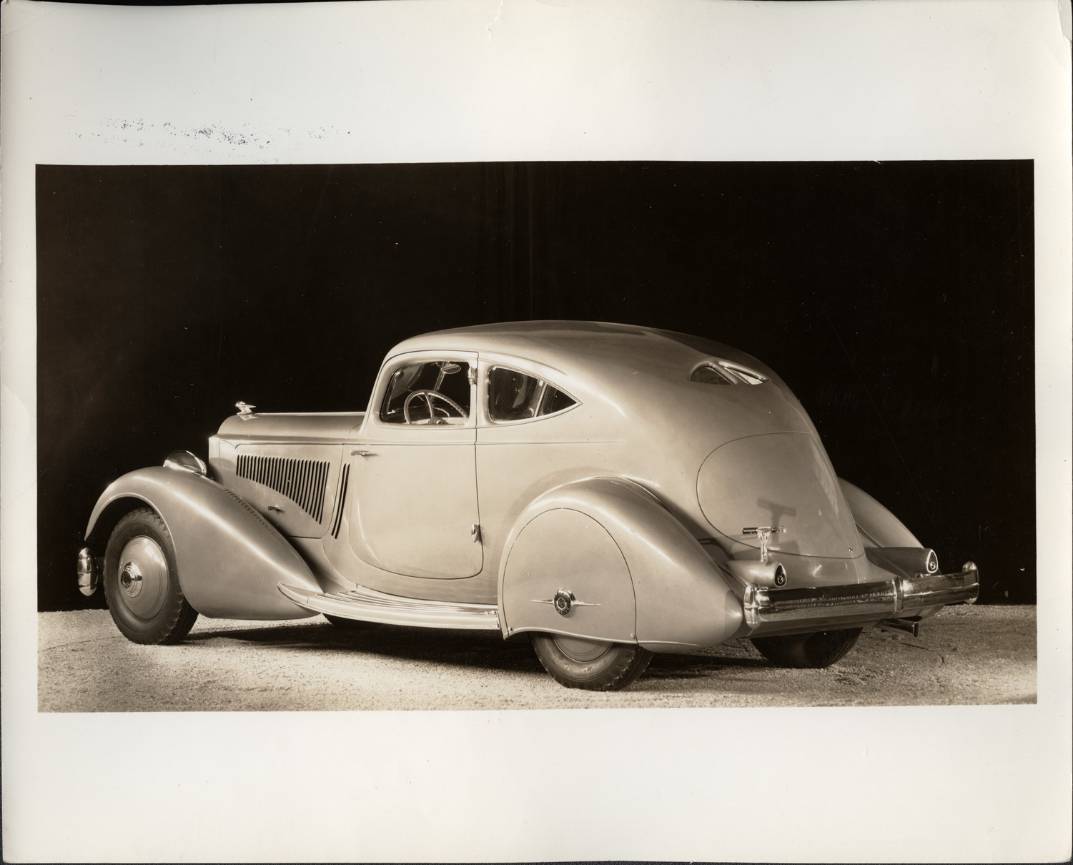 Packard Co. file photograph of a 1934 Packard three-quarter rear view. Inscribed on photo back: "Packard 1106 twelve, eleventh series, 12-cylinder, 160-horsepower, 135-inch wheelbase, 4-person sport coupe (body type #783; carried "Custom made by Packard" body plate), designed by LeBaron, first built of the 783 sports coupes; P.M.C. Co. authorized construction of three such cars on December 6th 1933, serial #1106-4, engine #901-601, had steel roof, quarter windows that did not lower or open in any way, exhibited on Packard stand at the 34th Annual National Automobile Show, New York City, N.Y., January 1934."