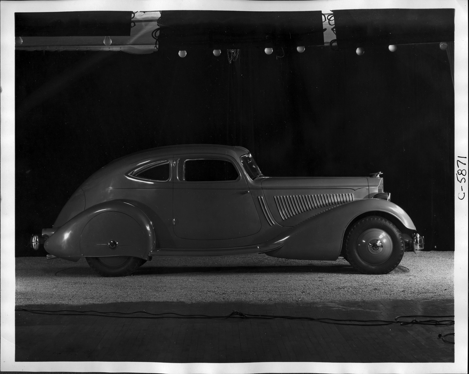 Packard Co. file photograph of a 1934 Packard right side view. Inscribed on photo back: "Packard 1106 twelve, eleventh series, 12-cylinder, 160-horsepower, 135-inch wheelbase, 4-person sport coupe (body type #783), designed by LeBaron, custom built by Packard first built of the 783 sports coupes to be constructed, serial #1106-4, engine #901-601, steel roof, quarter windows that did not open, exhibited on Packard stand at the 34th Annual National Automobile Show, New York City, N.Y., January 1934."