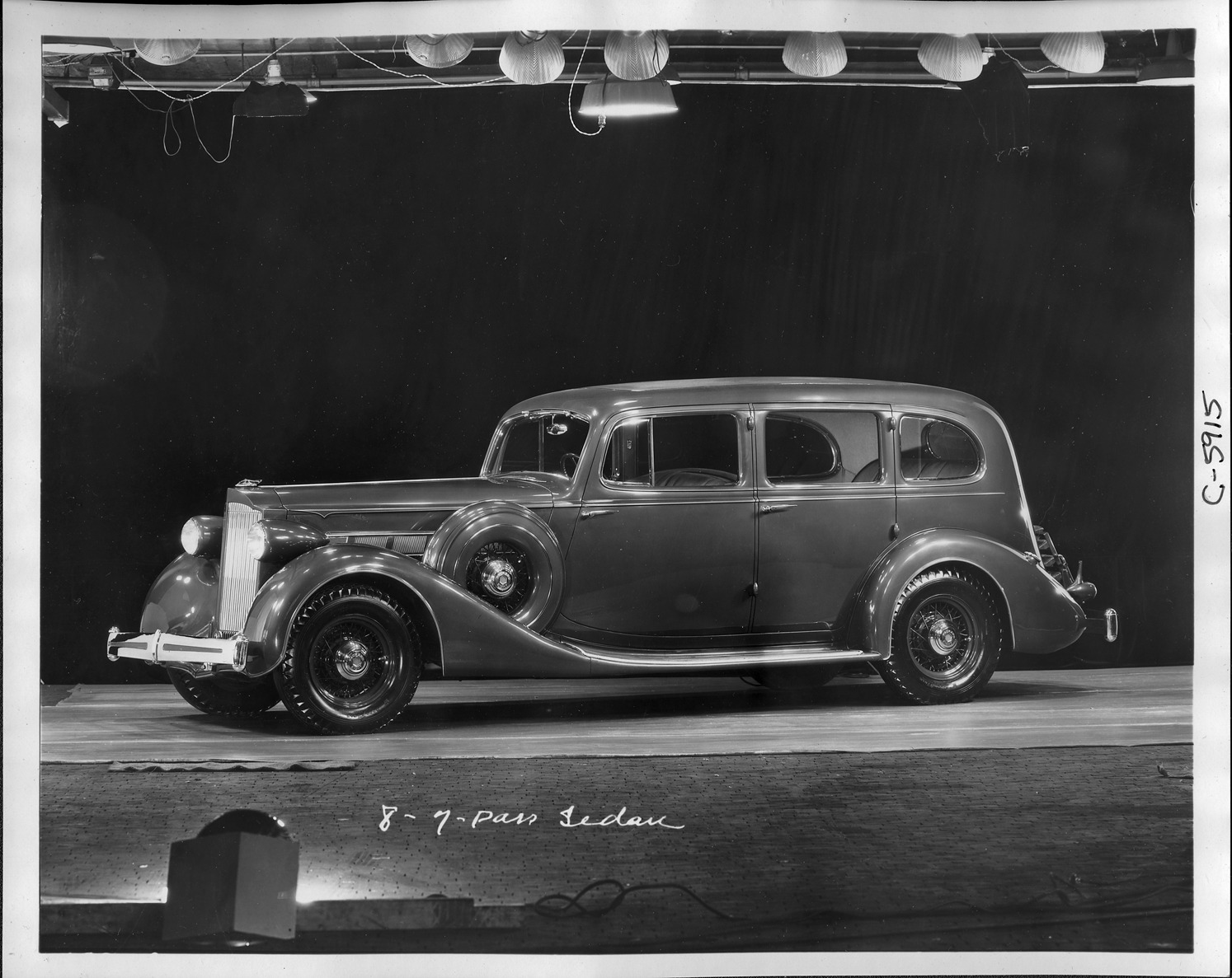 Packard Co. file photograph of a 1935 Packard seven-eights left side view, side mounted spare tire with fitted metal cover. Inscribed on photo back: "Packard eight, model 1202, twelfth series, 8-cylinder, 130-horsepower, 139-inch wheelbase, 7-person sedan (body type #814)."