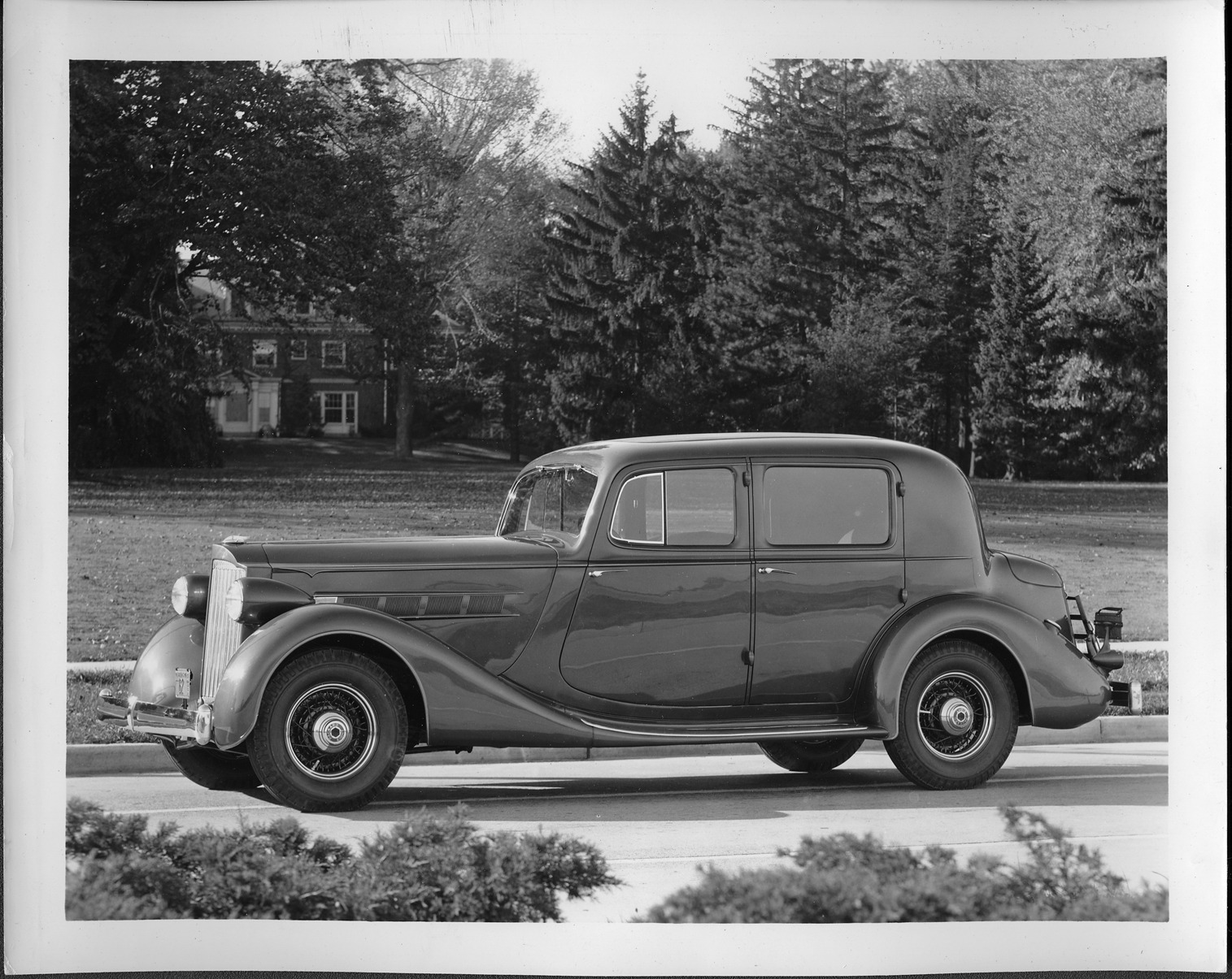 Packard Co. file photograph of a 1935 Packard nine-tenths left side view. Inscribed on photo back: "Packard eight, model 1201, twelfth series, 8-cylinder, 130-horsepower, 134-inch wheelbase, 5-person club sedan (body type #816), note Michigan dealer & MFG plate #62, setting: Grosse Pointe, Mich."