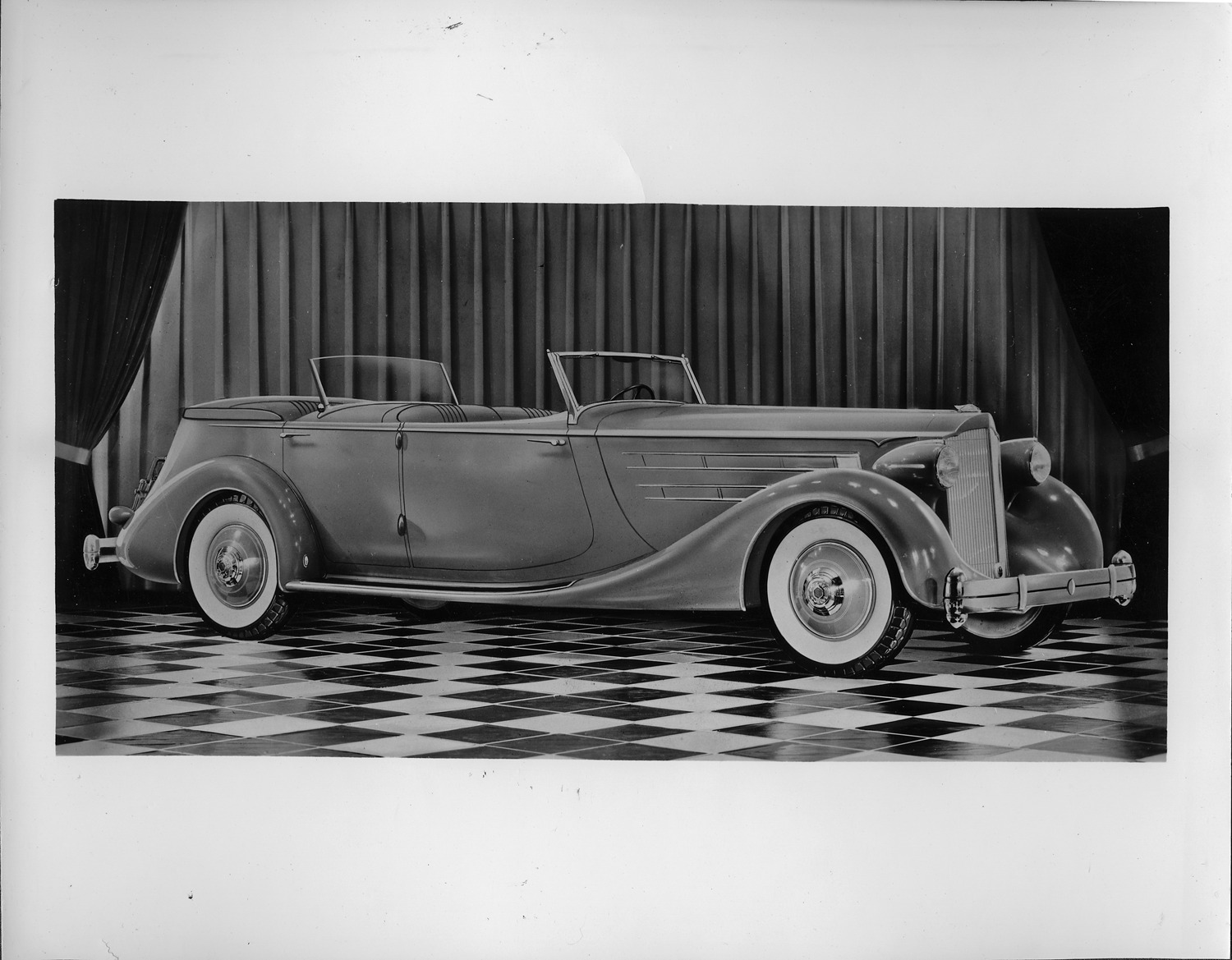 Packard Co. file photograph of a 1935 Packard seven-eights right side view, top folded. Inscribed on photo back: "Packard twelve, model 1207, twelfth series, 12-cylinder, 175-horsepower, 139-inch wheelbase, 4-person sport phaeton (body type #821)."