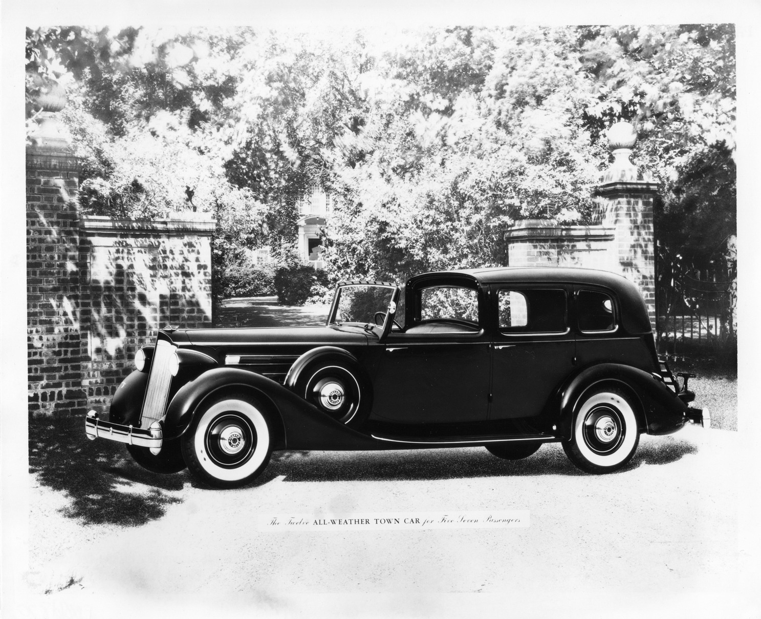 Packard Co. file photograph of a 1936 Packard twelve, all weather town car by LeBaron, nine-tenths left side view, side mounted spare tire with fitted metal cover, white sidewall tires, parked in front of brick gateway, house in distance.