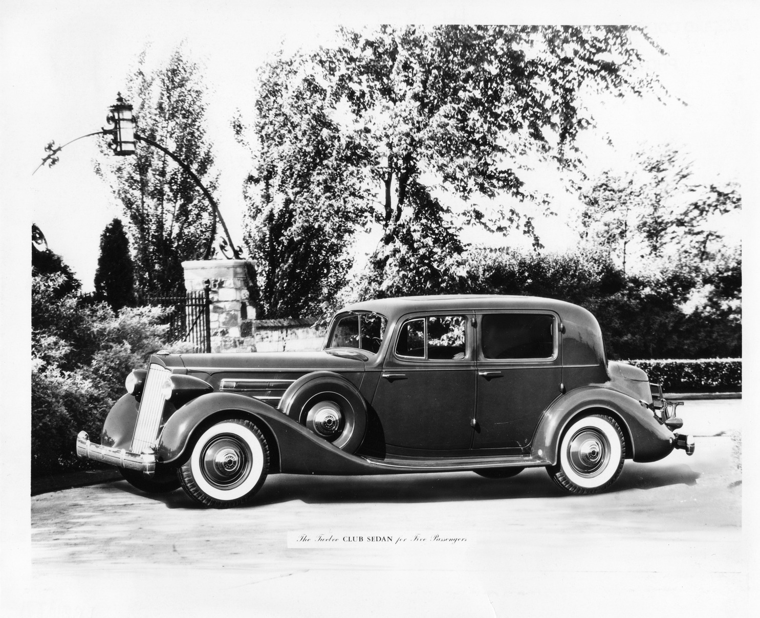 Packard Co. file photograph of a 1936 Packard twelve, 5-person club sedan, seven-eights left side view, side mounted spare tire with fitted metal cover, white sidewall tires, parked on drive, gateway in background.