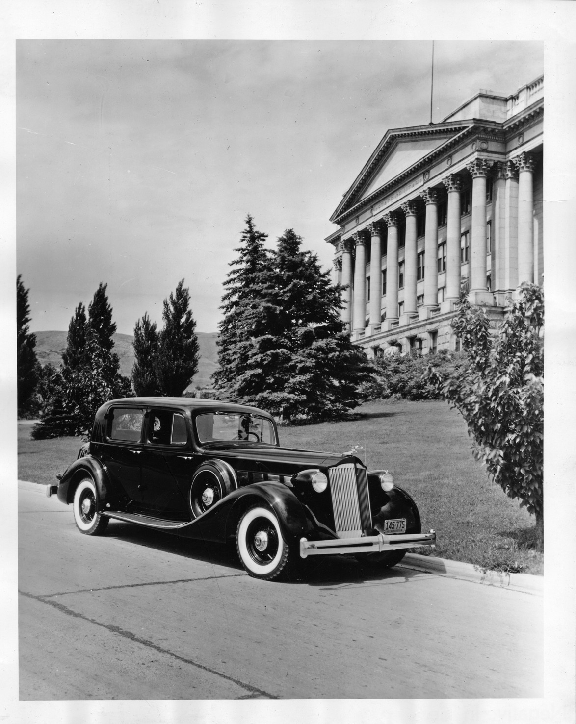 1936 Packard club sedan, parked on street in front of Utah state Capitol Building