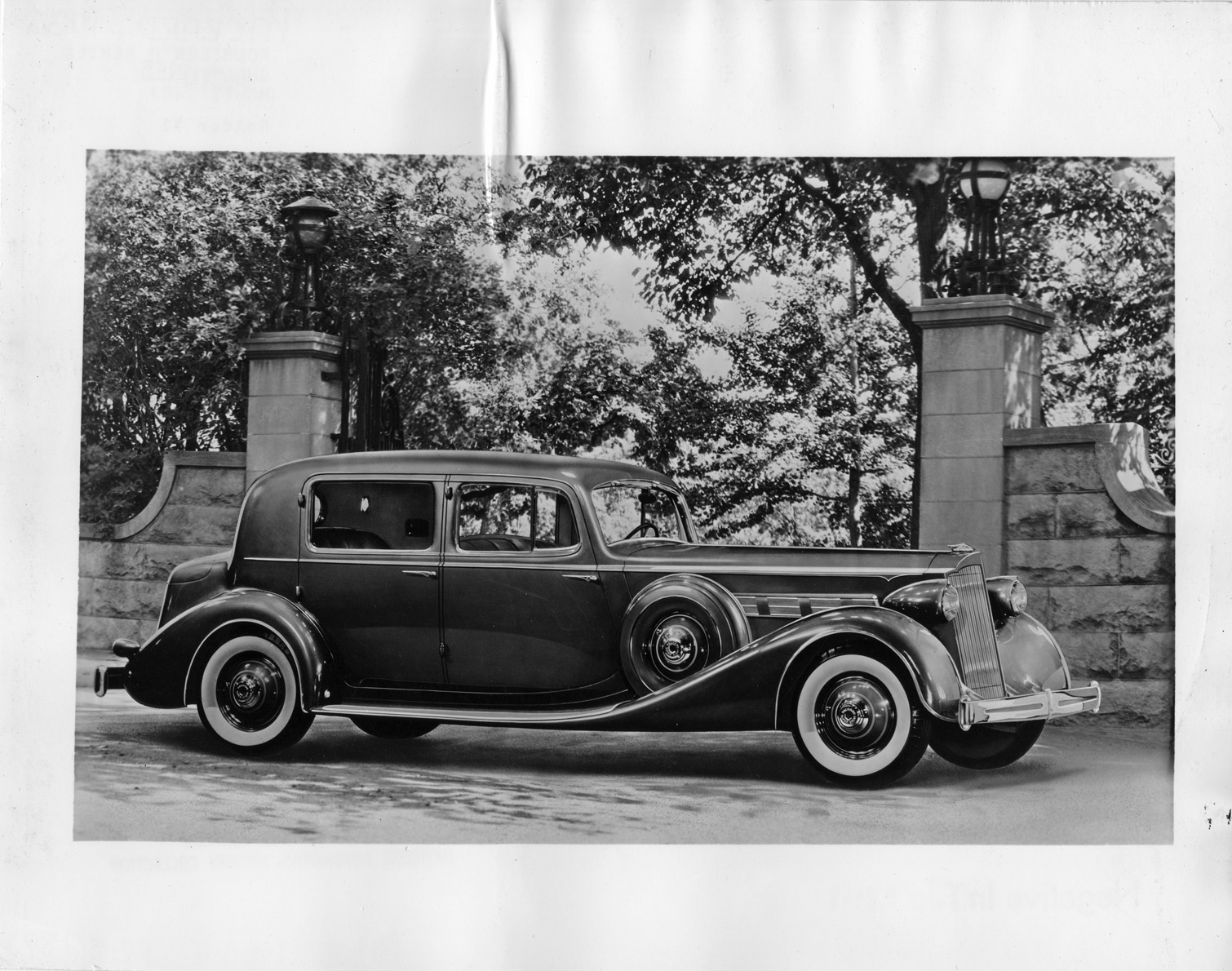 Packard Co. file photograph of a 1936 Packard nine-tenths right side view, parked in front of stone gateway. Inscribed on photo back: "Packard super eight, fourteenth series, model 1404, 8-cylinder, 150-horsepower, 139.25-inch wheelbase, 5-person club sedan (body type #956)."