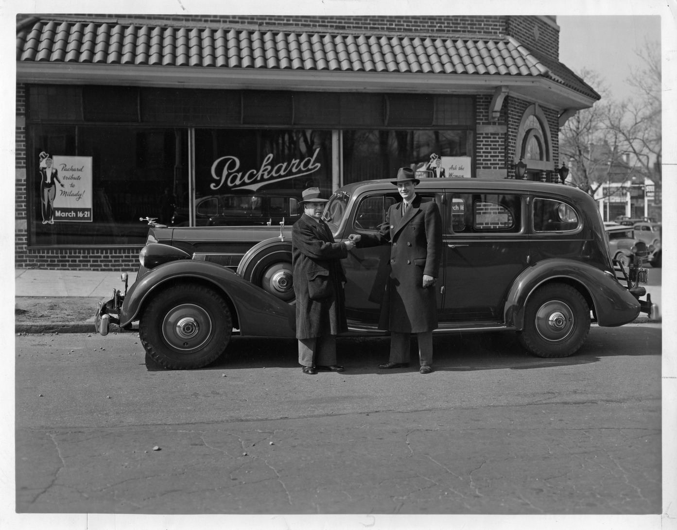 Packard Co. file photograph of a 1936 Packard left side view, parked on street in front of Packard dealership, two men standing at driver's door. Inscribed on photo back: "Packard eight, fourteenth series, model 1402, 8-cylinder, 130-horsepower, 139-inch wheelbase, 7-person limousine (body type #915), note bumper guards, Packard deluxe emblem, 6-wheel equipment, twin mirrors."