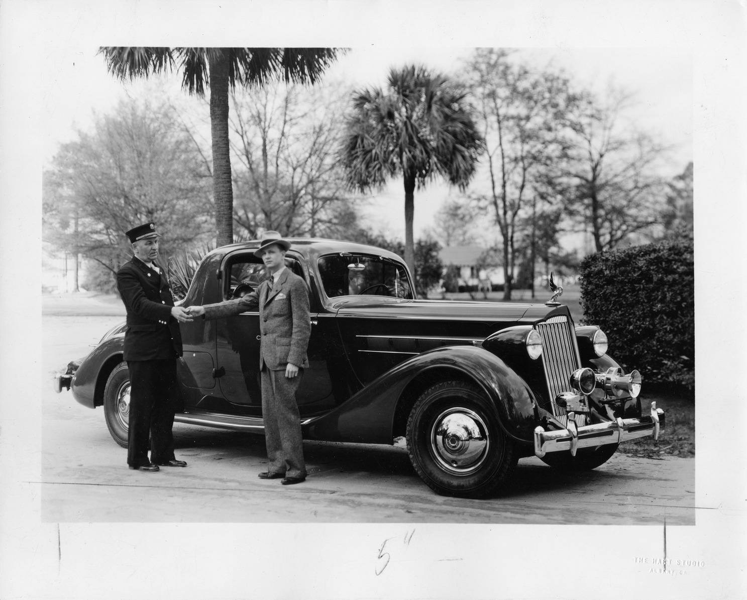 Packard Co. file photograph of a 1936 Packard seven-eights right side view, parked on street, male handing keys to uniformed male at passenger door. Inscribed on photo back: "Packard eight, fourteenth series, model 1401, 8-cylinder, 130-horsepower, 134-inch wheelbase, 2/4-person coupe (body type #918), note bumper guards, pelican emblem, chromium plated wheel discs, flashing red light, siren, fire chief accepting keys."