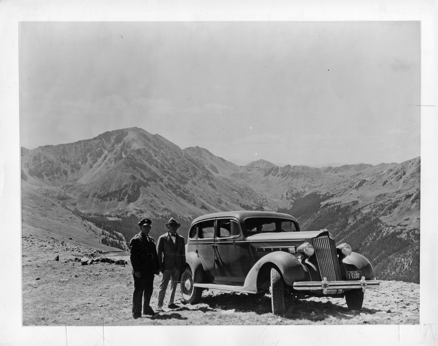 Packard Co. file photograph of a 1936 Packard three-quarter right front view, two men standing near passenger side, Colorado mountains in background. Inscribed on photo back: "Packard one twenty, fourteenth series, model 120-B, 8-cylinder, 120-horsepower, 120-inch wheelbase, 5-person touring sedan (body type #992), note 1936 Colorado license plate #1-5100, setting: Colorado Mountains( Pikes Peak/Continental Divide?)"