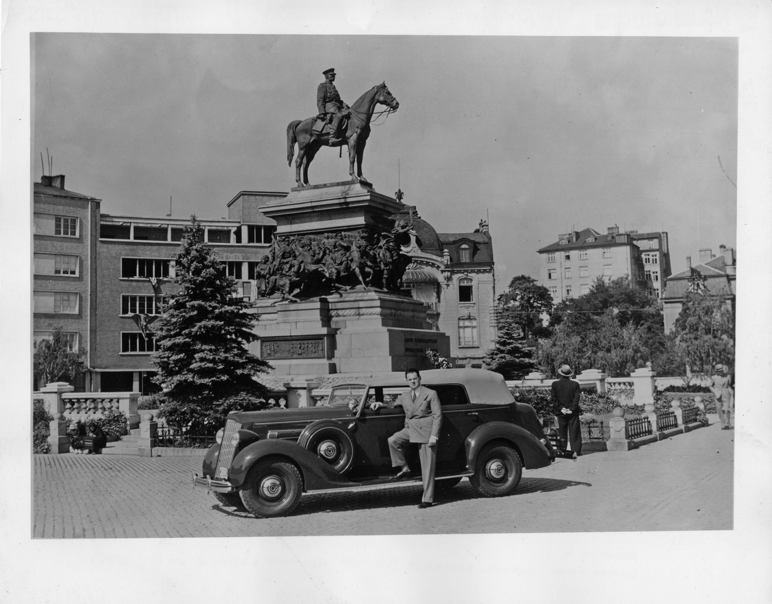 Packard Co. file photograph of a 1936 Packard nine-tenths left side view, top raised, parked on street in front of "King Liberator's" monument, male standing at driver's door with foot on running board. Inscribed on photo back: "Packard one twenty, fourteenth series, model 120-B, 8-cylinder, 120-horsepower, 120-inch wheelbase, 5-person convertible sedan (body type #999), Lazare Gheron, Packard distributor for Bulgaria, setting: Sofia, before "King Liberator's" monument."