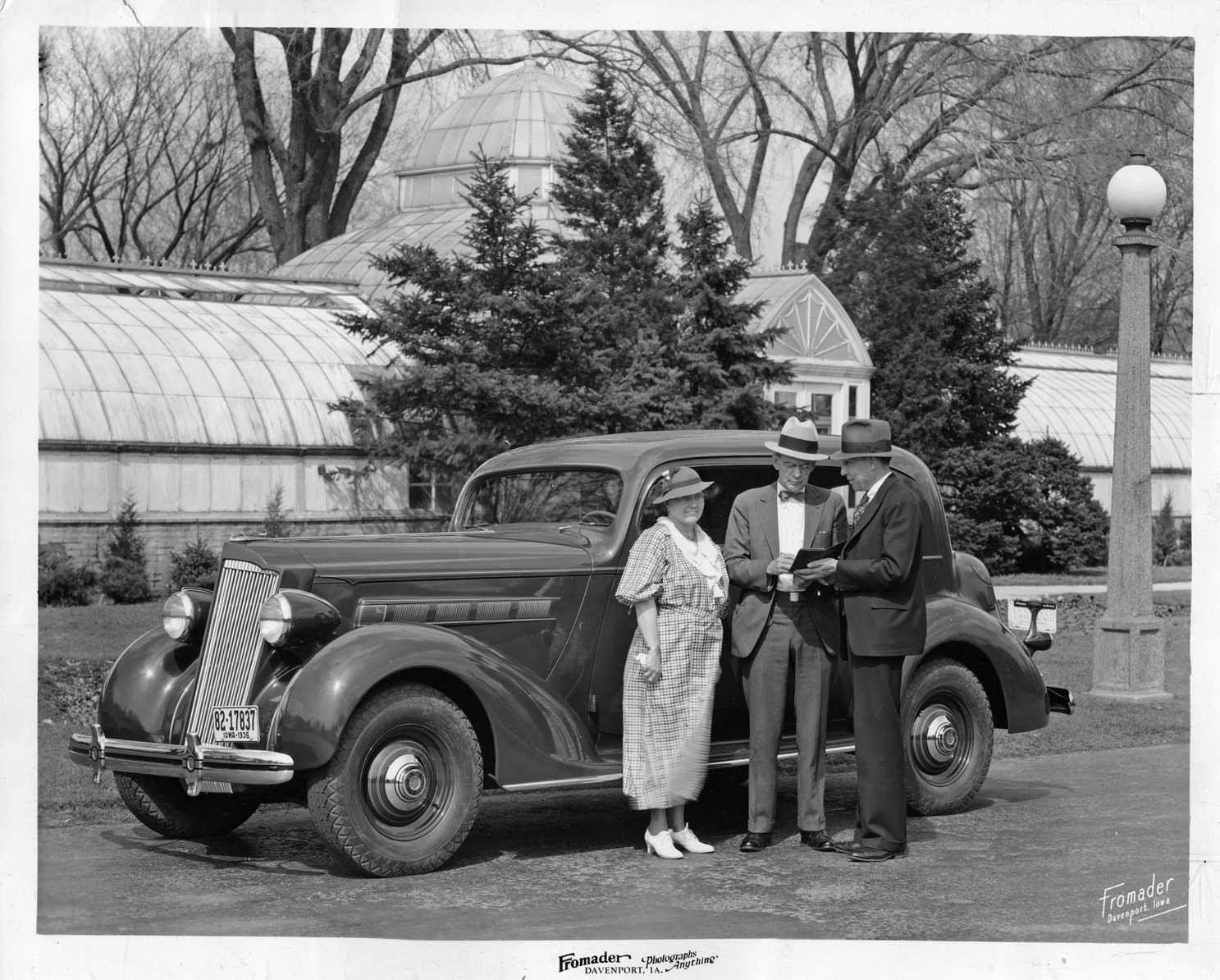 Packard Co. file photograph of a 1936 Packard three-quarter left front view in front of what appears to be a conservatory or greenhouse, couple standing at driver's door, other male holding something for other to sign. Inscribed on photo back: "Packard one twenty, fourteenth series, model 120-B, 8-cylinder, 120-horsepower, 120-inch wheelbase, 5-person touring sedan (body type #994), note 1936 Iowa license plate #82-17837."