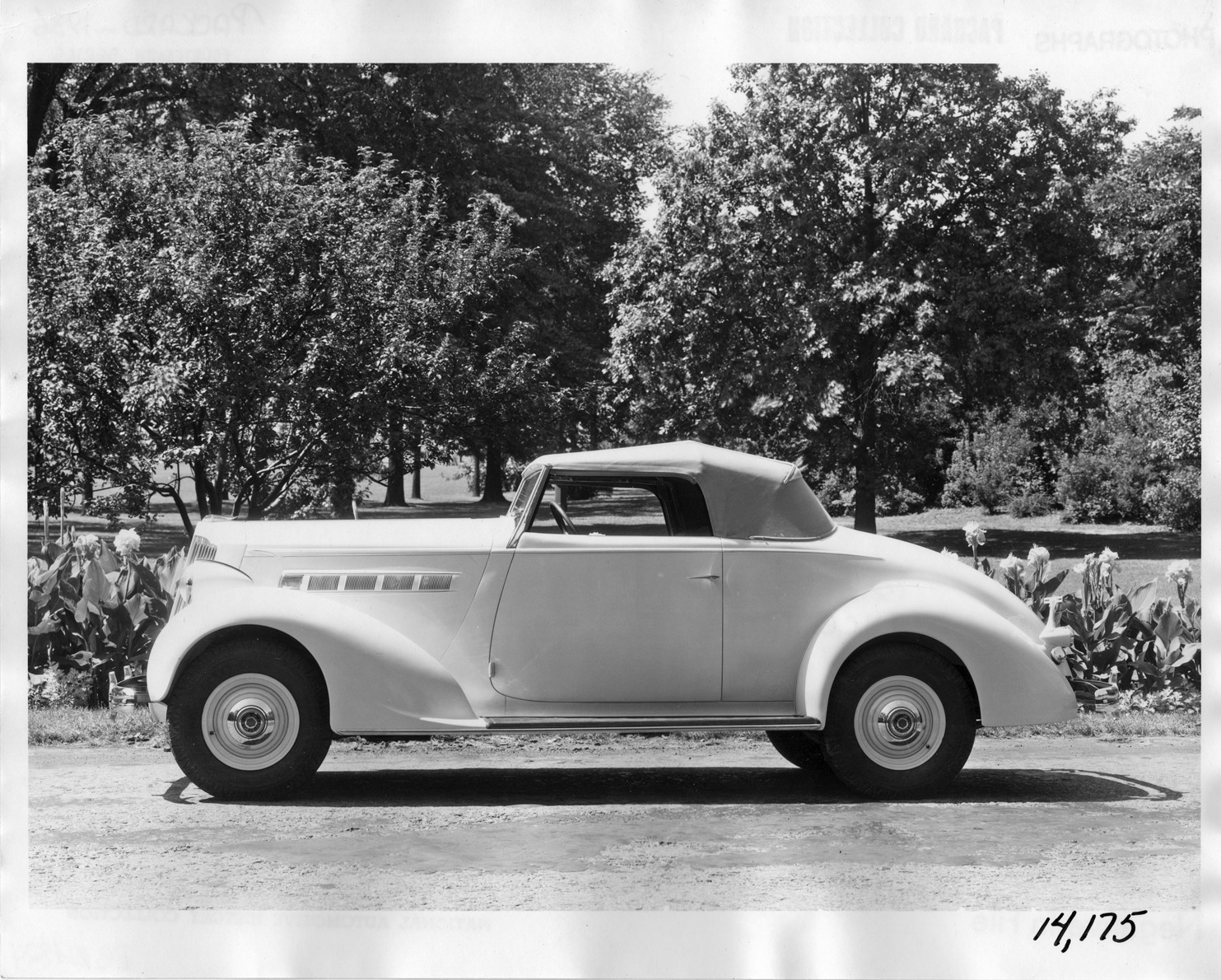 Packard Co. file photograph of a 1936 Packard left side view, top raised, parked on scenic dirt road. Inscribed on photo back: "Packard one twenty, fourteenth series, model 120-B, 8-cylinder, 120-horsepower, 120-inch wheelbase, 2/4-person convertible coupe (body type #999)."