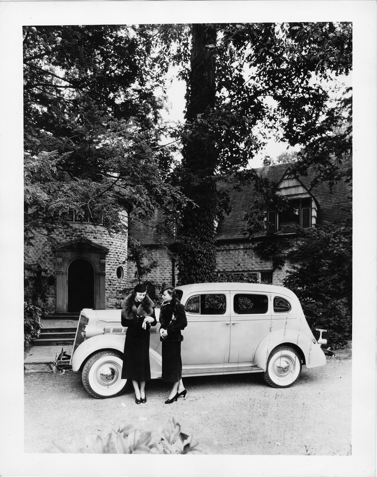 Women posing with 1937 Packard sedan, left side view, parked in front of home