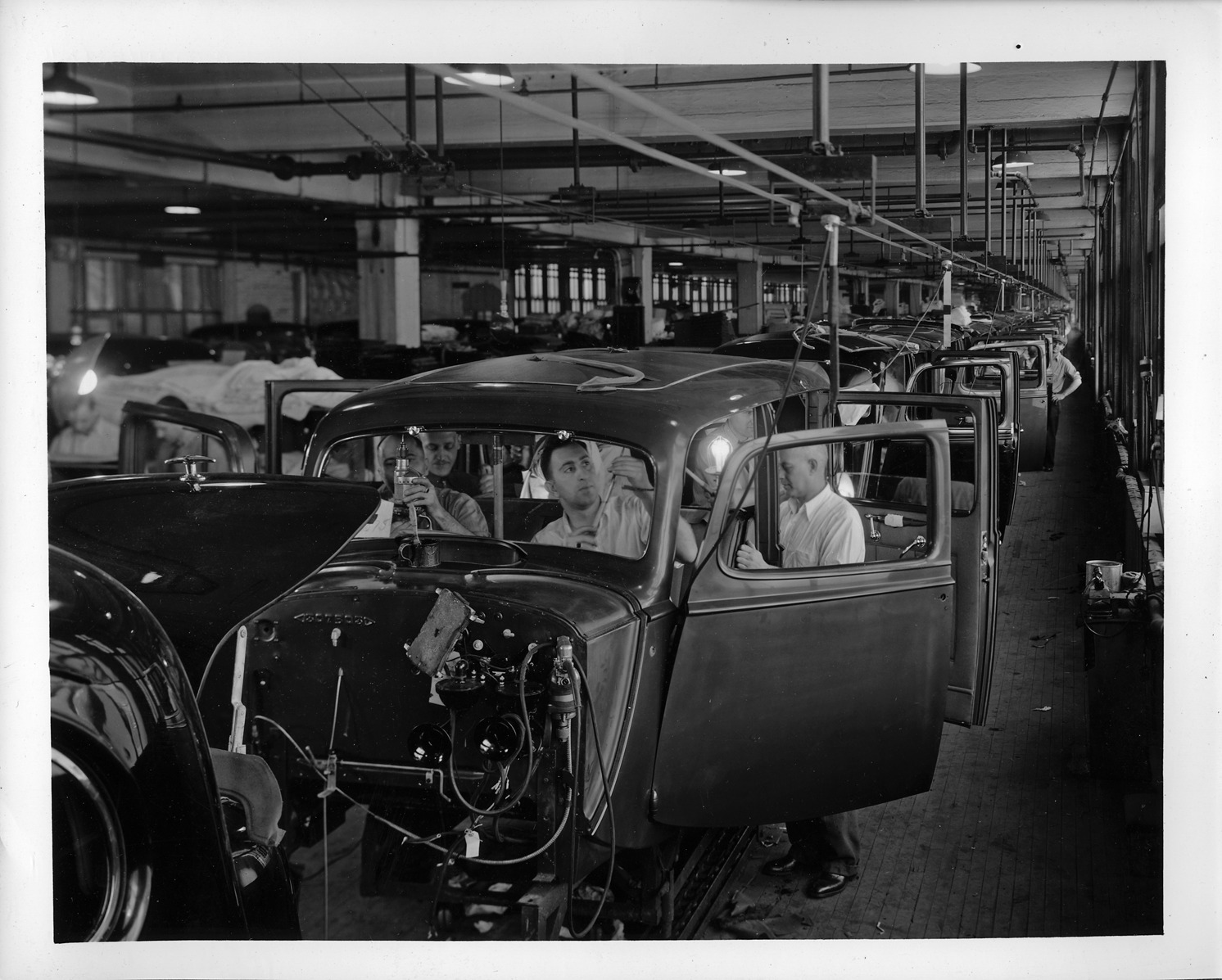 Packard Co. file photograph of a 1937 production line picture, several touring sedan bodies can be see from front with workers. Inscribed on photo back: "Packard super eight, fifteenth series, model 1502, 8-cylinder, 135-horsepower, 139-inch wheelbase, 7-person touring sedan (body type #1014), setting: body plant, interior trim."