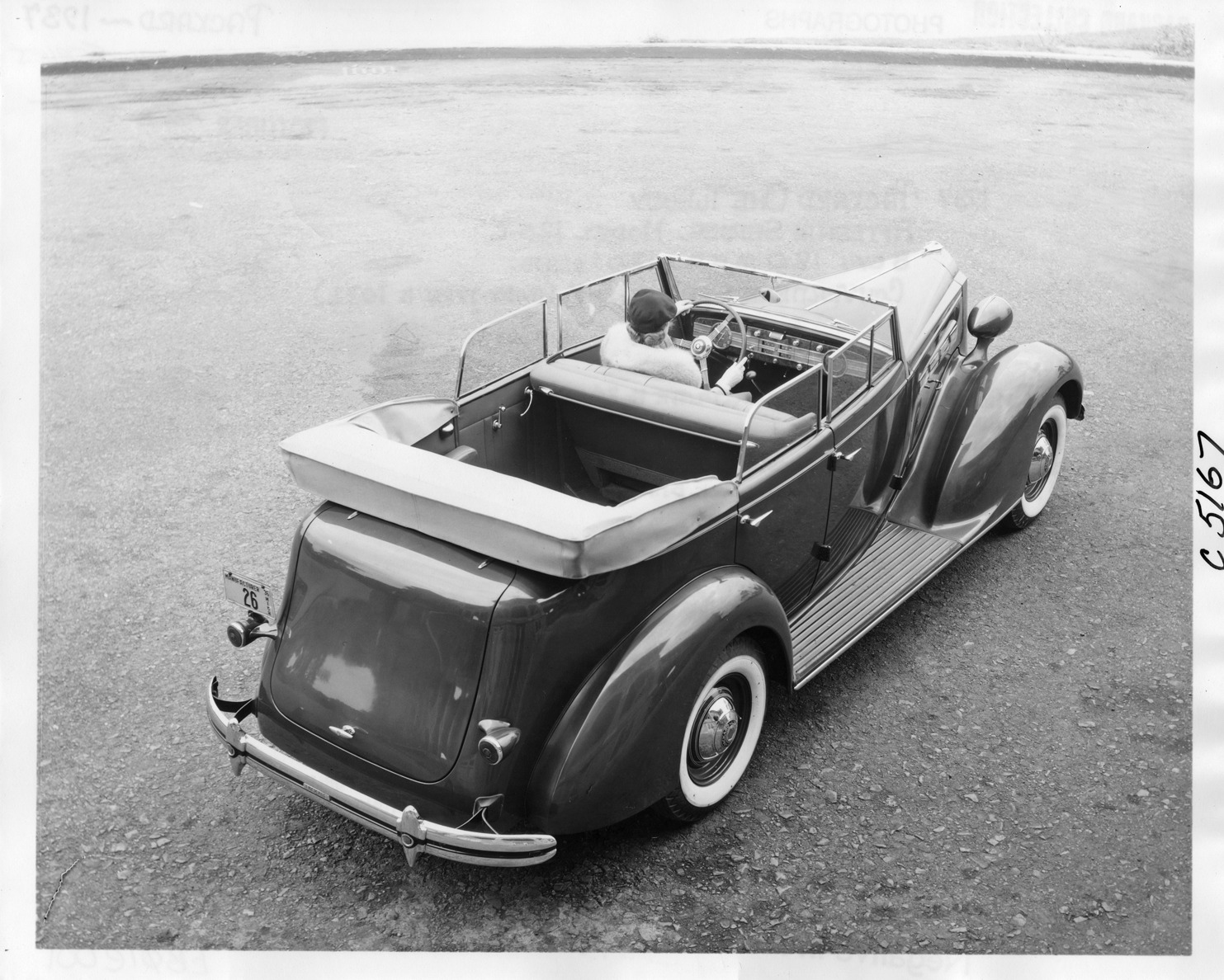 Favorite this☆ 1937 Packard convertible sedan, three-quarter rear view, top folded, woman behind wheel Description: Packard Co. file photograph of a 1937 Packard three-quarter rear view from above, top folded, woman behind wheel. Inscribed on photo back: "Packard one twenty, fifteenth series, model 120-C, 8-cylinder, 120-horsepower, 120-inch wheelbase, 5-person convertible sedan (body type #1097), note 1937 Michigan manufacturer plate #26, white sidewall tires, deluxe steering wheel, plates covering spaces provided for cigar lighter, radio controls, clock dial." Details Resource ID: EB01e001 Creator: Packard Motor Car Company Subject: Packard automobile Automobiles, Convertible Photographic prints Date Issued: 1937 Format: 1 photographic print ; 8 x 10 in. Member of: National Automotive History Collection Packard Collection Rights: Physical rights are retained by DPL. Copyright is retained in accordance with U.S. copyright laws.