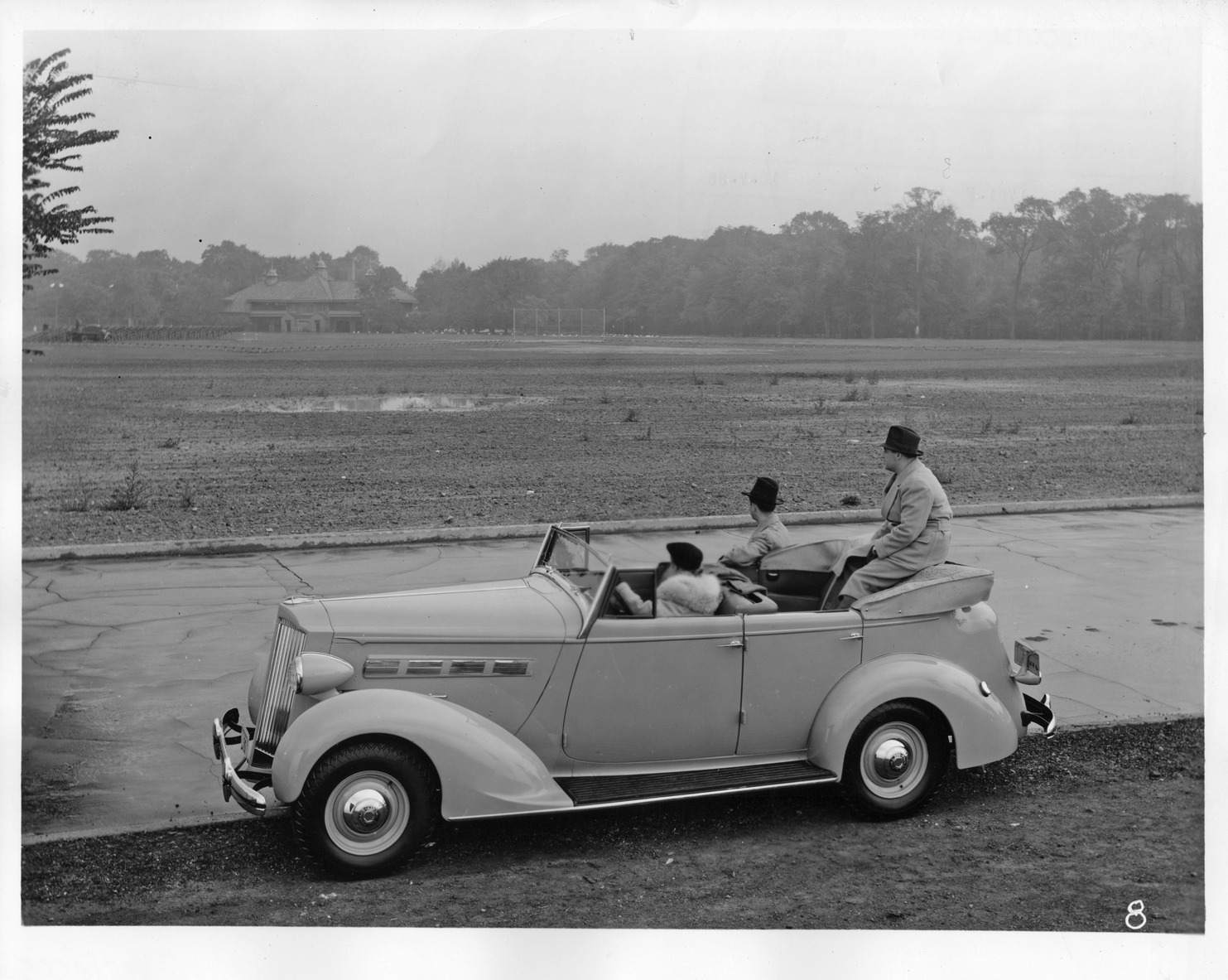 Packard Co. file photograph of a 1937 Packard nine-tenths left side view, top folded with male sitting on top, woman behind wheel, male standing on right rear side, parked on grass, baseball field in background. Inscribed on photo back: "Packard one twenty, fifteenth series, model 120-C, 8-cylinder, 120-horsepower, 120-inch wheelbase, 5-person convertible sedan (body type #1097)."