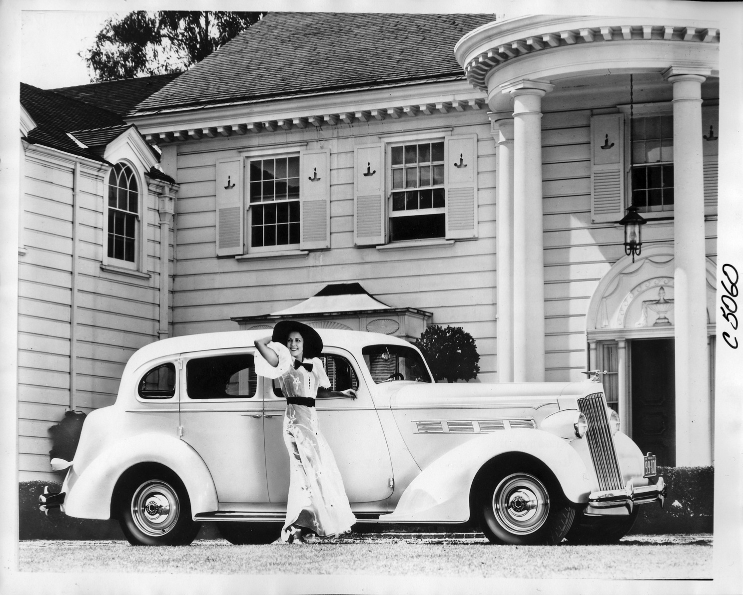1937 Packard touring sedan with woman in long dress and hat